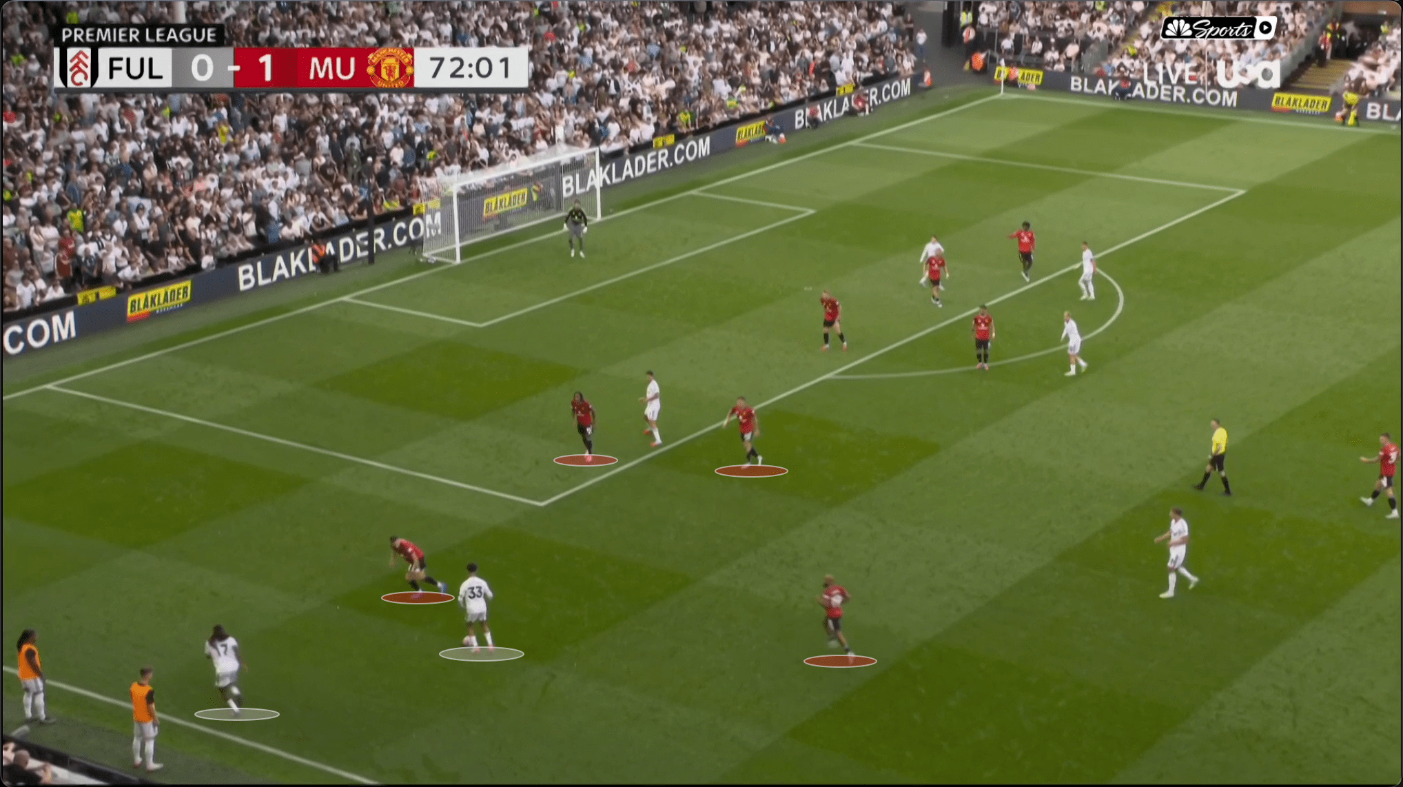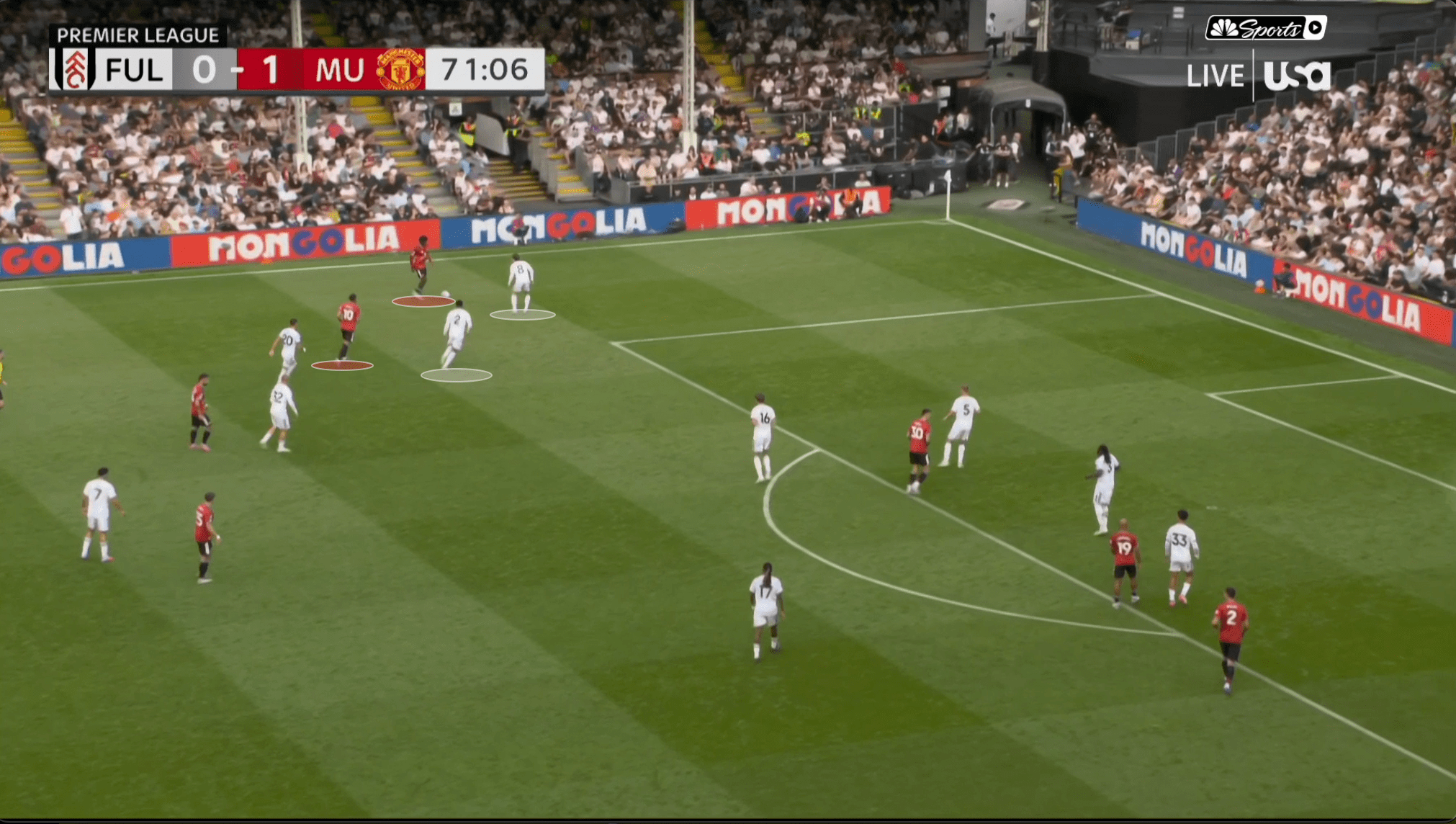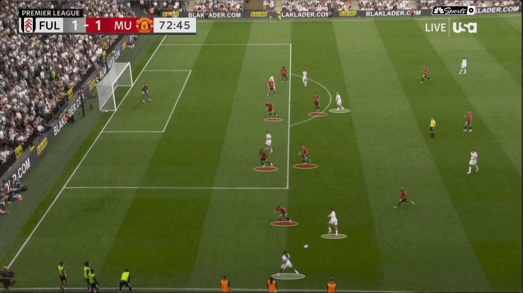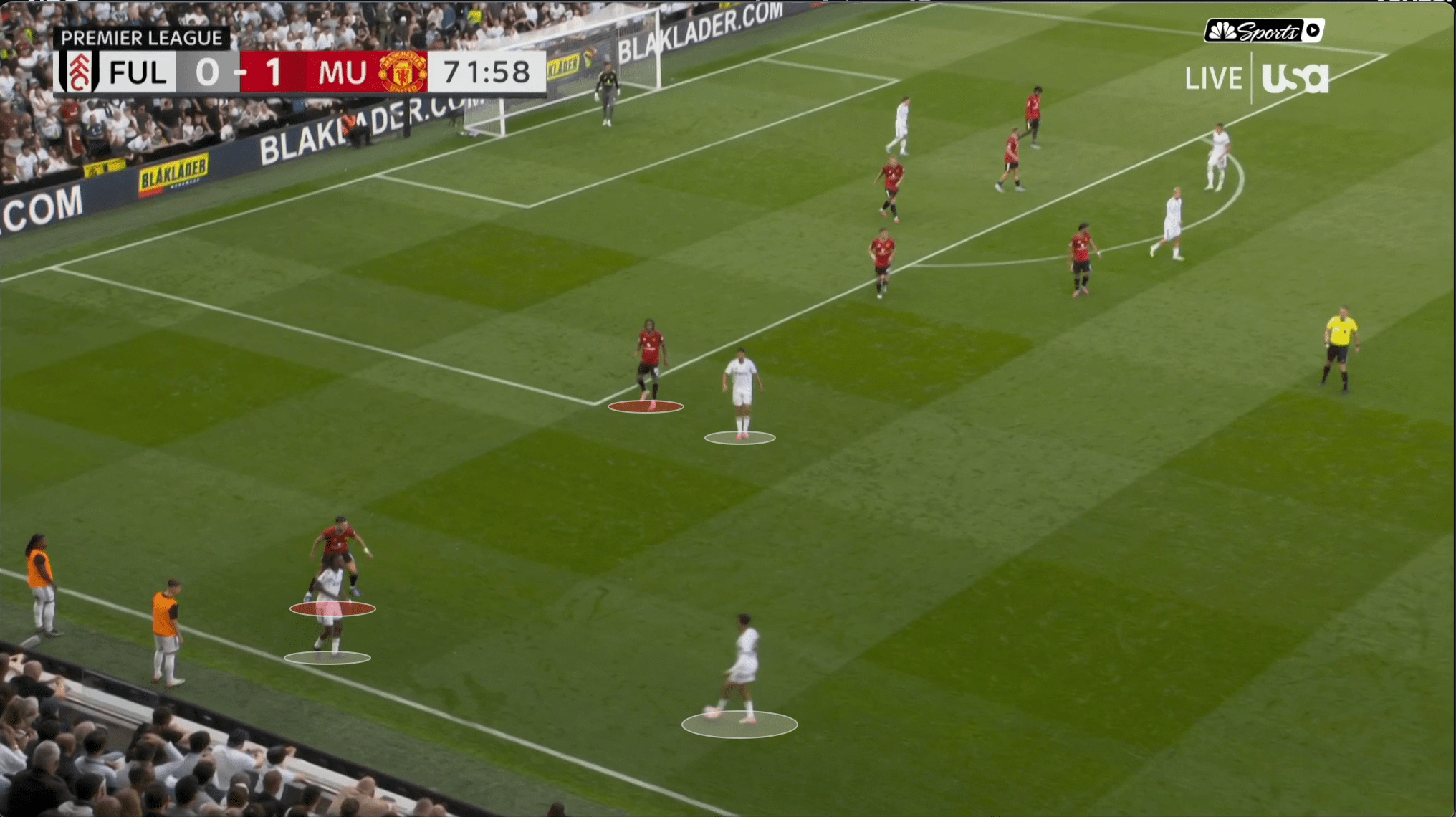 «Юнайтед» вроде бы успевает вернуться, но быстрая потеря Диогу Далота и снова дыра в обороне. Несмотря на то что «Фулхэм» зеркалил схему и лишал «Юнайтед» ширины, уже через секунды они создают численное преимущество 2 в 1 против Далота и 3 в 2 против Далота и Йоро.