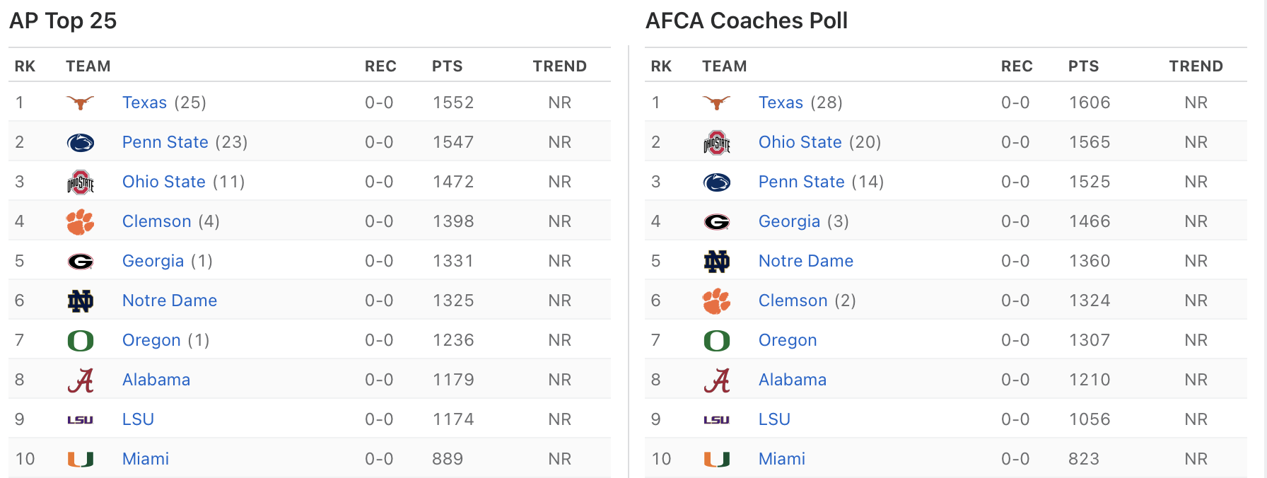 Техас на первом месте, но пара Пенн Стейт и Огайо Стейт достаточно близко (сыграют между собой в ноябре). Далее идут Клемсон, Джорджия и Нотр Дам, как видно и журналистам, и тренерам сложно определиться, кто здесь более предпочтителен, но все команды имеют хороший потенциал. Затем идет Орегон, от которого много ждали год назад и он был хорош на протяжении всей регулярки, но провалил игру в плей-офф с Огайо. Помните?