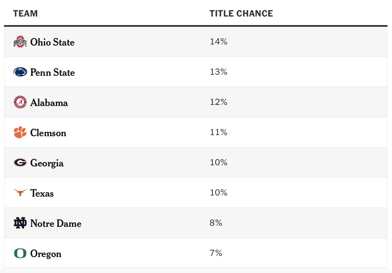 Пенн Стейт очень похож на Мичиган (будет ниже) и Огайо Стейт последних двух лет, это команда, полная игроков уровня НФЛ, которые остались еще на год, чтобы попытаться выиграть титул. Это конечно не безупречная команда — очень сильно страдала пасовая игра год назад — но Пенн Стейт это хорошее сочетание таланта и опыта. Да, Джеймс Франклин имеет статистику 1-15 против команд из первой пятерки, но обычно у него просто была команда слабее в таких матчах. Кажется, в этом году это так. А в новой системе плей-офф из 12 команд можно проиграть одну-две игры и все равно выиграть, как это случилось с Огайо.
