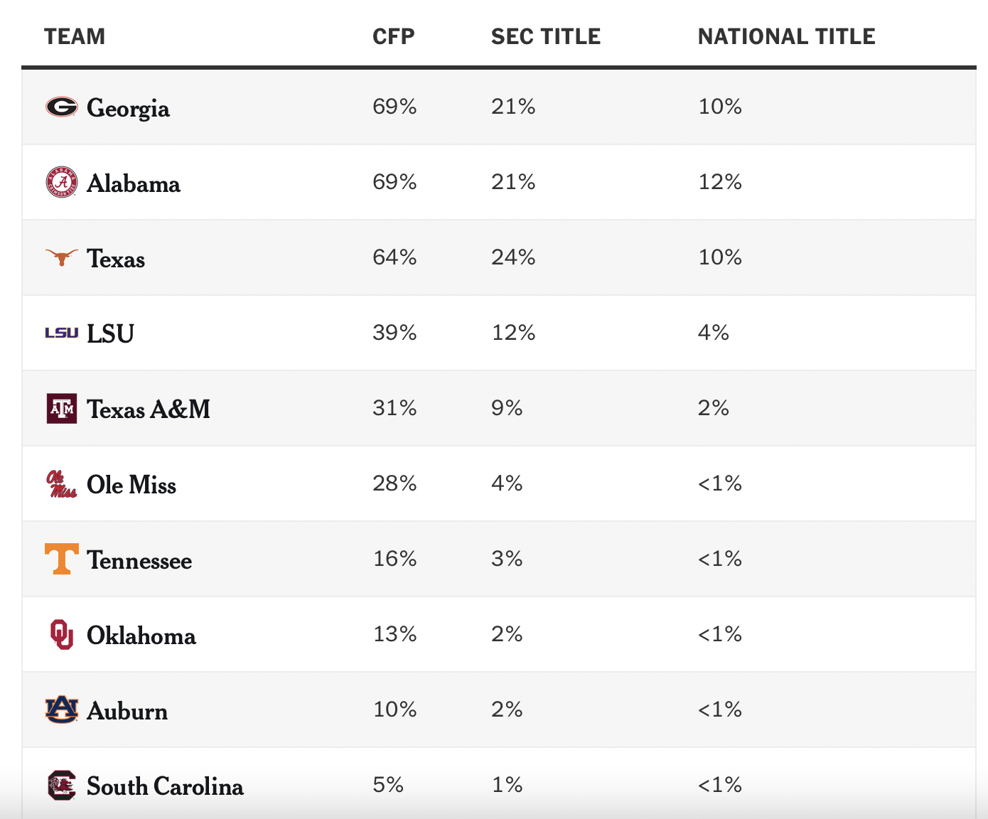 Замыкают десятку команды с юга страны — Алабама во второй сезон де Буера, Луизиана с Брайоном Келли, который еще не выигрывал стартовый матч сезона во главе тигров, и Майами, в очередной раз построенные вокруг перспективного квотербека — учитывая конференцию шансы набить статистику хорошие.