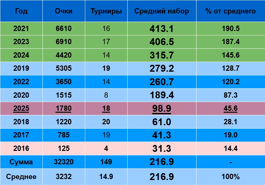 Надо заметить, что, если убрать из числа турниров ОИ-2021 и ОИ-2024, за которые очки не начислялись, то результат 2021 равен 440.7 очка, результат 2024 – 340 очков.