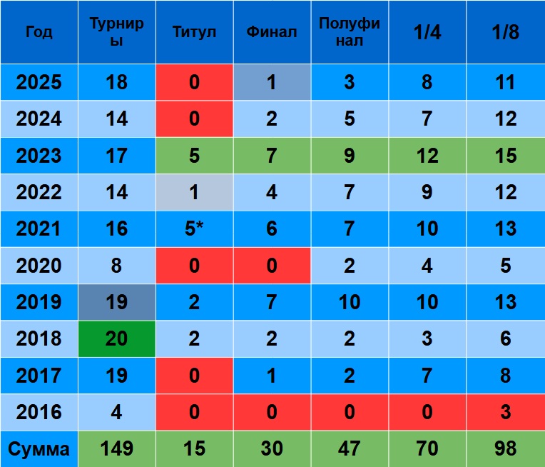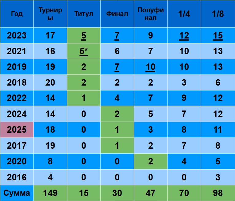 2025 – седьмой, есть финал + 2 полуфинала. Но, не забываем, в самом конце 2020-го, Даниил взял Мастерс + Итоговый. Так что, 2025 может и на восьмое место улететь…
