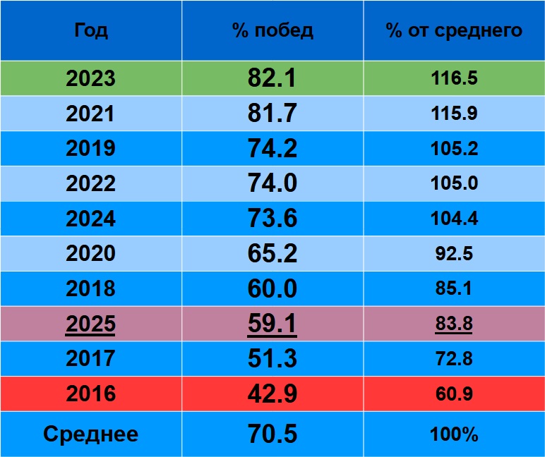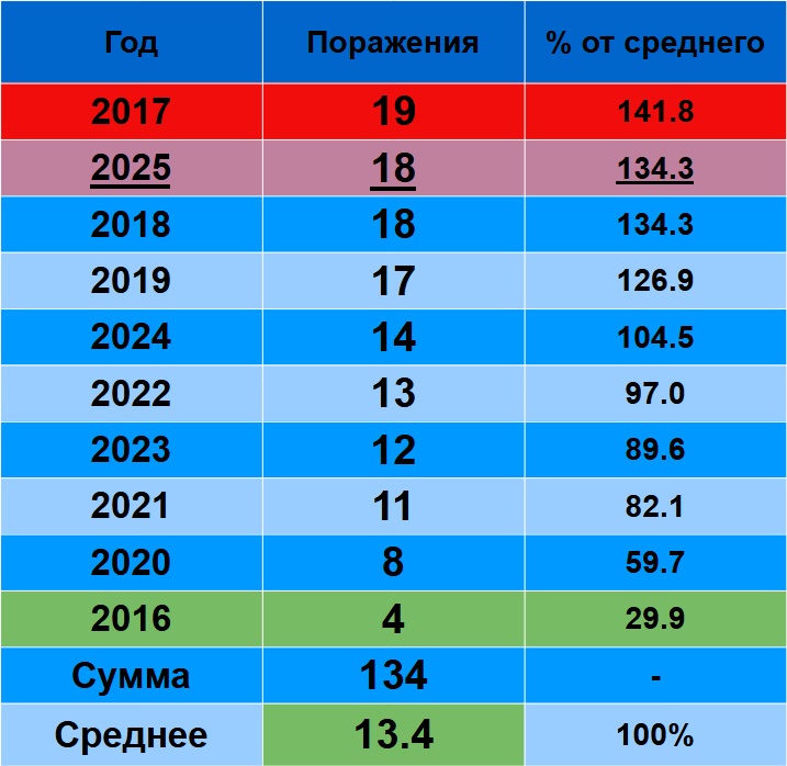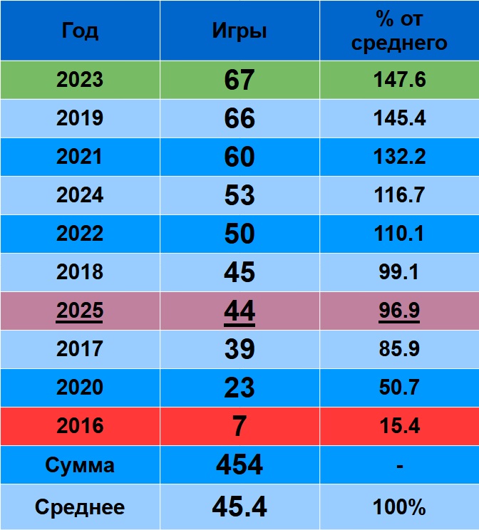 2025 – седьмой, уступая 2023 и 2021 в 4.1-4.2 раза! И даже среднему результату уступает в 2.19 раза.