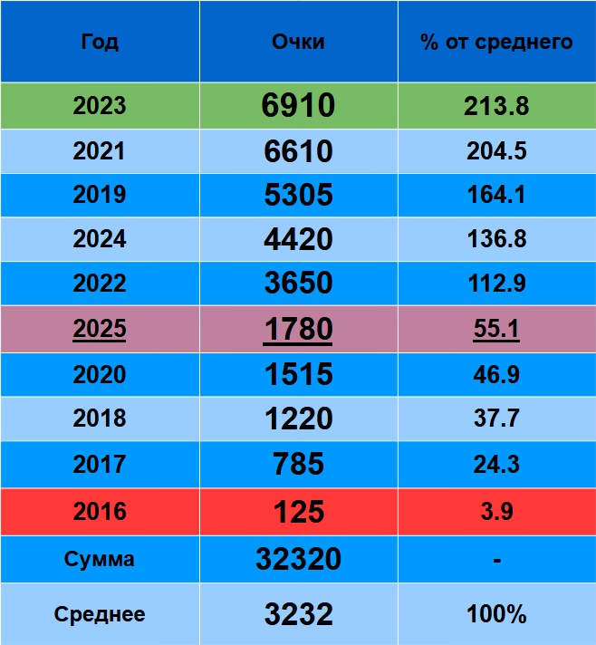 2025 – восьмой(!) и ощутимо хуже среднего результата за карьеру.