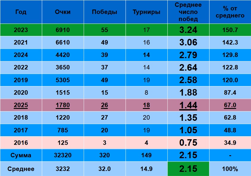 2025 – седьмой, уже на 6 побед меньше среднего результата за карьеру.