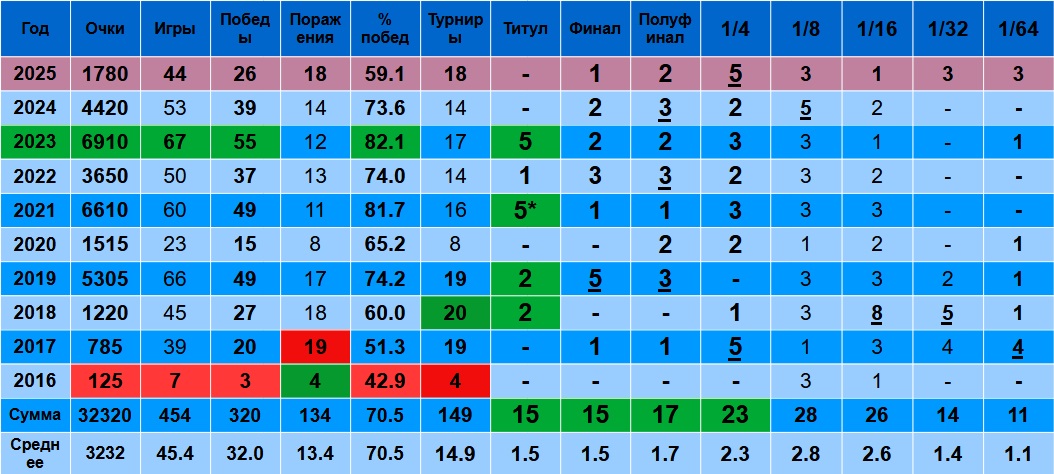В 2021-2024 было 11-14 поражений, в 2025 18 поражений. Много. Почти на 5 поражений больше, чем, в среднем по карьере – 13.4.