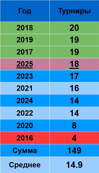В 2019 и 2017 по 19. В 2025 – 18, четвертое место в карьере по числу турниров.