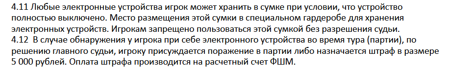 А дело в том, что опять правила четко регламентируют такие ситуации. Есть очень важное исключение, которое может прямо влиять на исход партии — телефон. Прочитаем еще раз внимательно Статью 11.3.2.2: Если очевидно, что игрок имеет такое устройство при себе в игровой зоне, ему присуждается поражение. Сопернику присуждается победа.