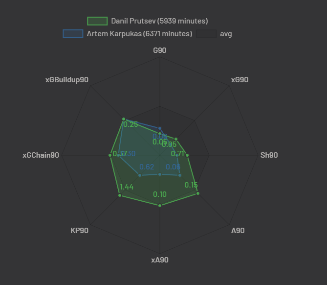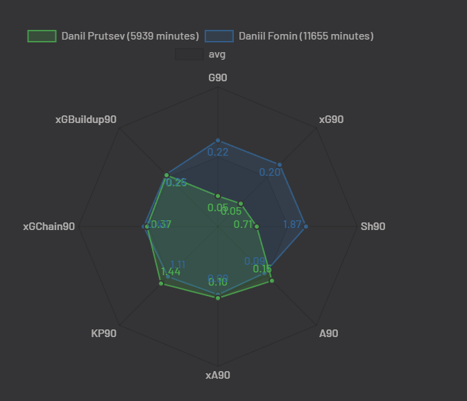 Показатели Фомина и Пруцева близки (KP90, хА90, А90, хGChain90, xGBuildup90), но Фомин превосходит Пруцева по ударам, голам и xG. В целом, Фомин выглядит более результативным игроком. Но стоит отметить что у Фомина в два раза больше игровых минут и большую часть своих голов он забил с пенальти.