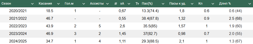 Эти данные значительно отличаются от классических опорных полузащитников (шестерок). Ниже будет представлена сравнительная диаграмма с Карпукасом, на которой все станет ясно.