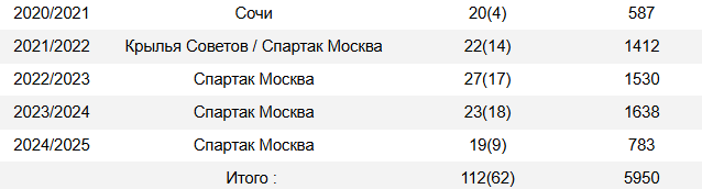 *Сезон РПЛ 2025/2026 в статистике не будет учитываться, так как Данил сыграл за «Спартак» всего 25 минут.