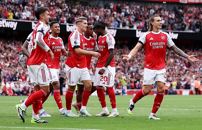 «Арсенал»: Давид Райя, Юрриен Тимбер, Риккардо Калафьори, Габриэл, Вильям Салиба, Итан Нванери, Мартин Субименди, Деклан Райс, Леандро Троссард, Виктор Дьокереш, Нони Мадуэке