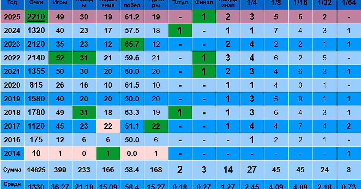 2025 сейчас выглядит более-менее нормально. На 4 поражения больше, чем в среднем по карьере. Однако, если отбросить 2014 год с 1 поражением, то среднее было бы уже 16.5 поражений - и 19 поражений выглядят не так уж страшно.