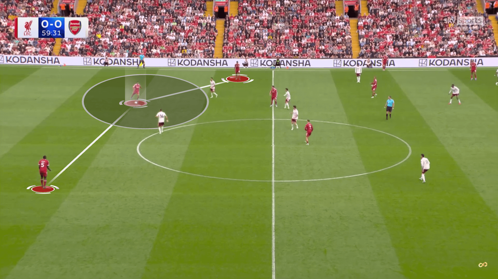 Отличие между командами было в акцентах, которые использовались для растягивания схемы. У «Ливерпуля» в полузащиту за Микелем Мерино выдергивался Вирджил ван Дейк, а сзади оставалась тройка – Керкез, Конате, Собослаи: