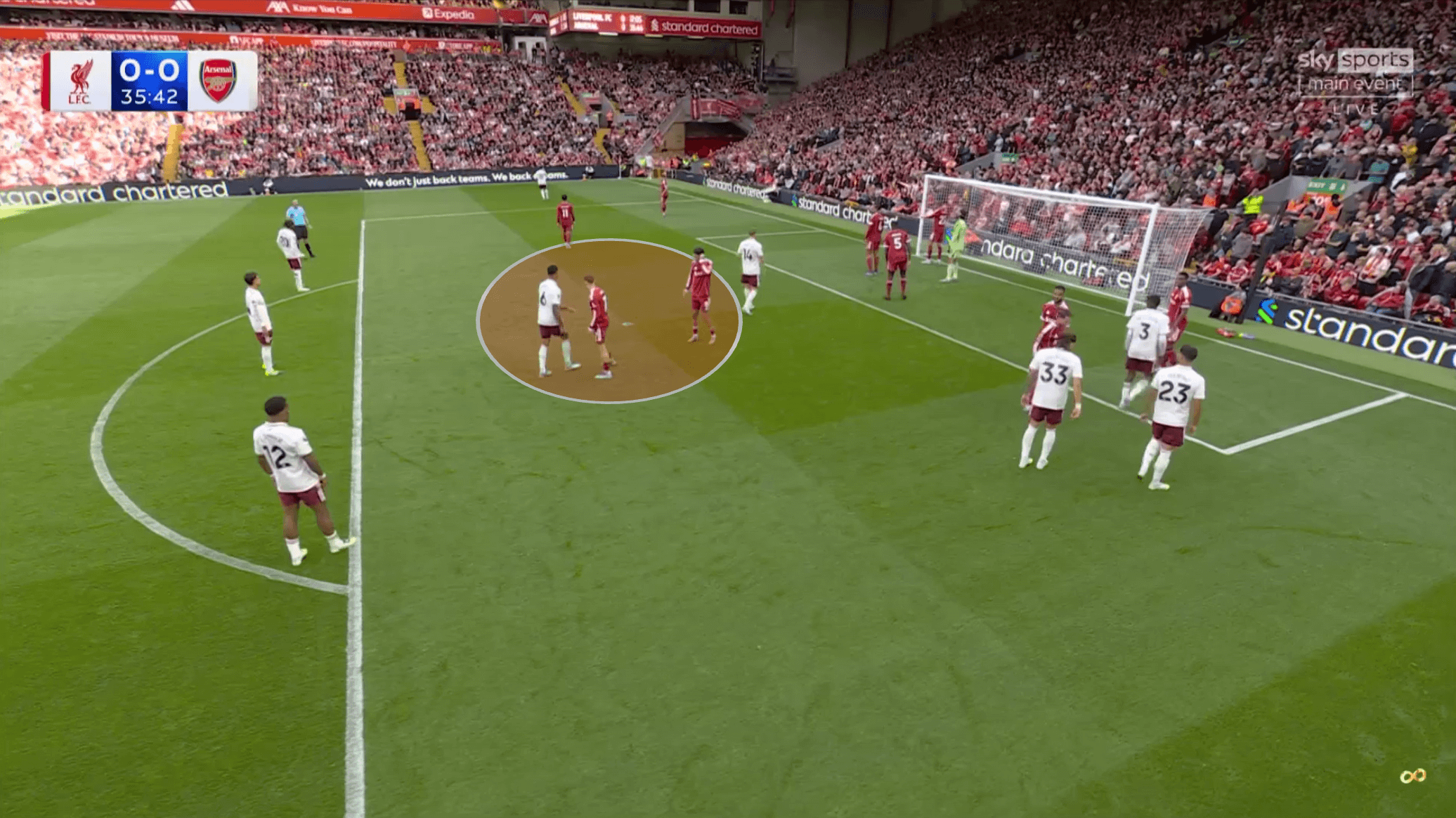 Такой прием против бразильца – не новость для АПЛ. Когда Габриэл на пике, не помогает даже он. Здесь сработало. Виртц отвечал за стартовый рывок Габриэла – плотно встречал и мешал разогнаться. Задача Собослаи – проследовать за защитником в зону, которую тот выбирал. У Габриэла все же получилось один раз пробить, но с игры, а не на угловом.