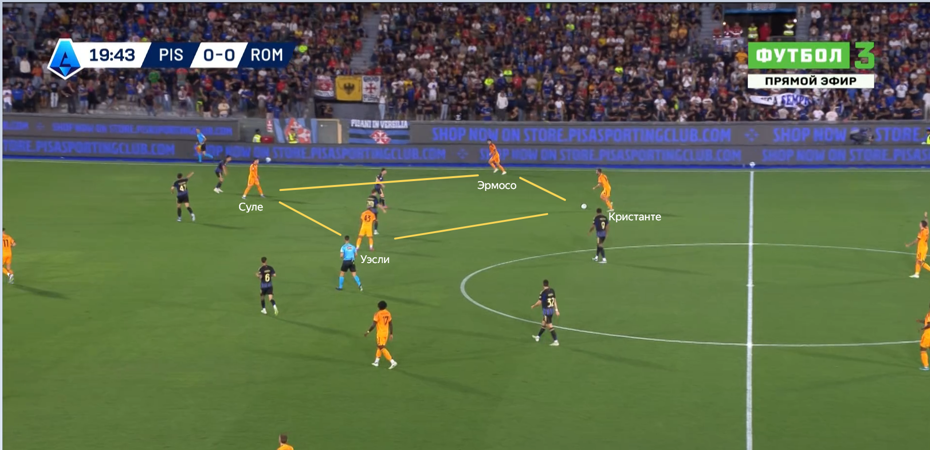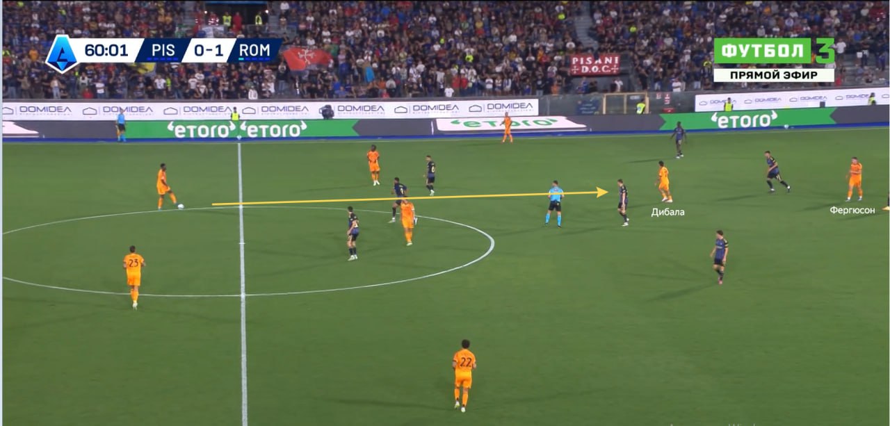 Напоминает классический тренировочный квадрат 4-2. Понятно, что в этом ромбе римляне могут извлечь преимущество в двух сценариях: играя вокруг двух игроков «Пизы» (через Уэсли или Эрмосо) или насквозь передачей на Суле. Но возникает вопрос: на сколько такая конфигурация обоснованна? Игроки «Пизы» обороняются зонно. Футболистам в оранжевом никого запутывать сменой позиции не надо.