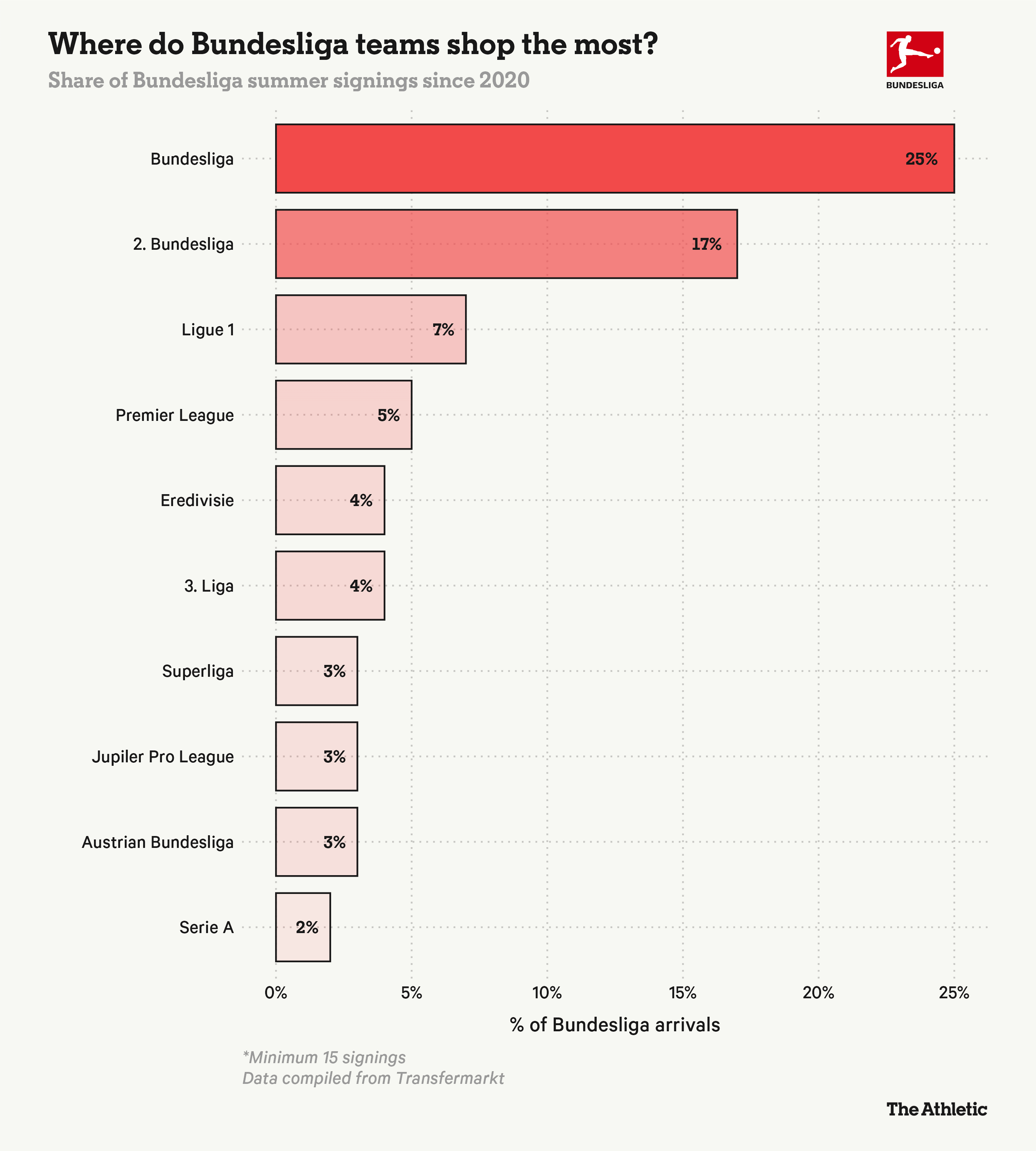 За последние пару лет команды Бундеслиги делали ставку на игроков из Нидерландов и Австрии. С 2020 года 5,4% летних трансферов Бундеслиги (без учета аренд) пришлись на игроков всех дивизионов Нидерландов и Австрии соответственно. За последние 5 лет клубы Бундеслиги обращали особое внимание к игрокам из Бундеслиги, второго дивизиона (2-й Бундеслиги) и даже третьего (3-й Лиги). Если учесть летние приобретения из четвертого дивизиона и молодежных лиг, то 49% игроков, прибывших в Бундеслигу с 2020 года, пришли из немецких клубов.