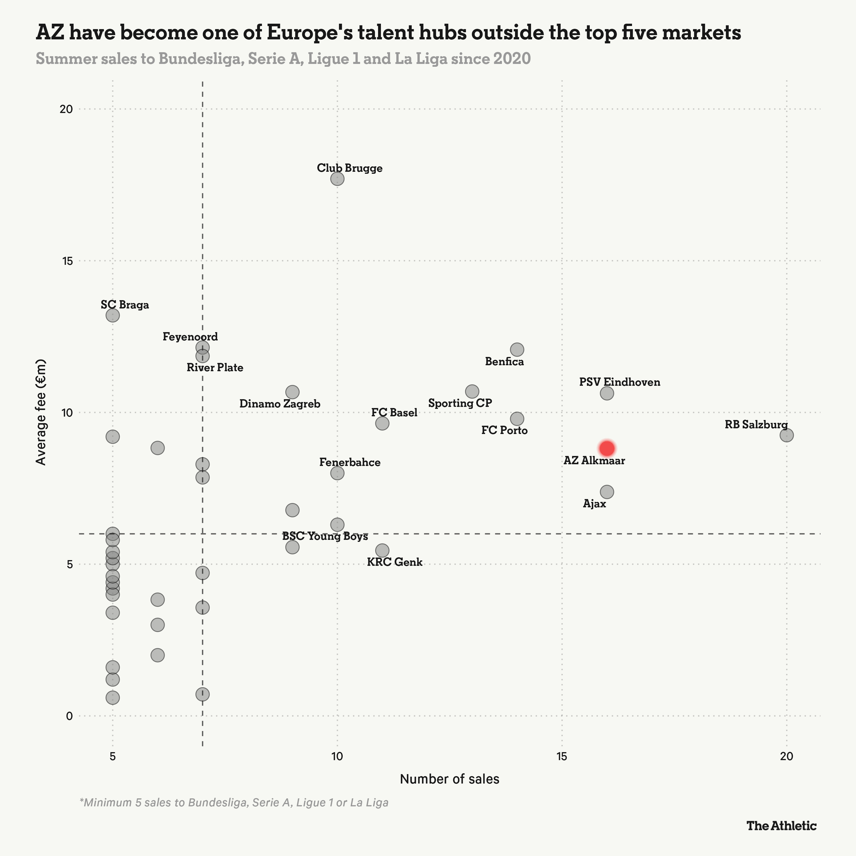 С 2020 года 20% летних продаж «Зальцбурга» пришлись на Серию А, Бундеслигу, Лигу 1 и Ла Лигу — это самый высокий процент среди клубов за пределами топ-5 европейских лиг. Стоит также отметить «АЗ» — клуб стал одним из лучших европейских направлений для покупки игроков.