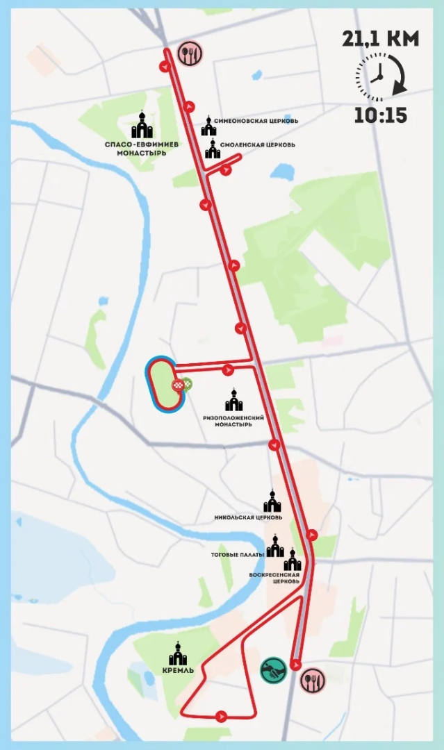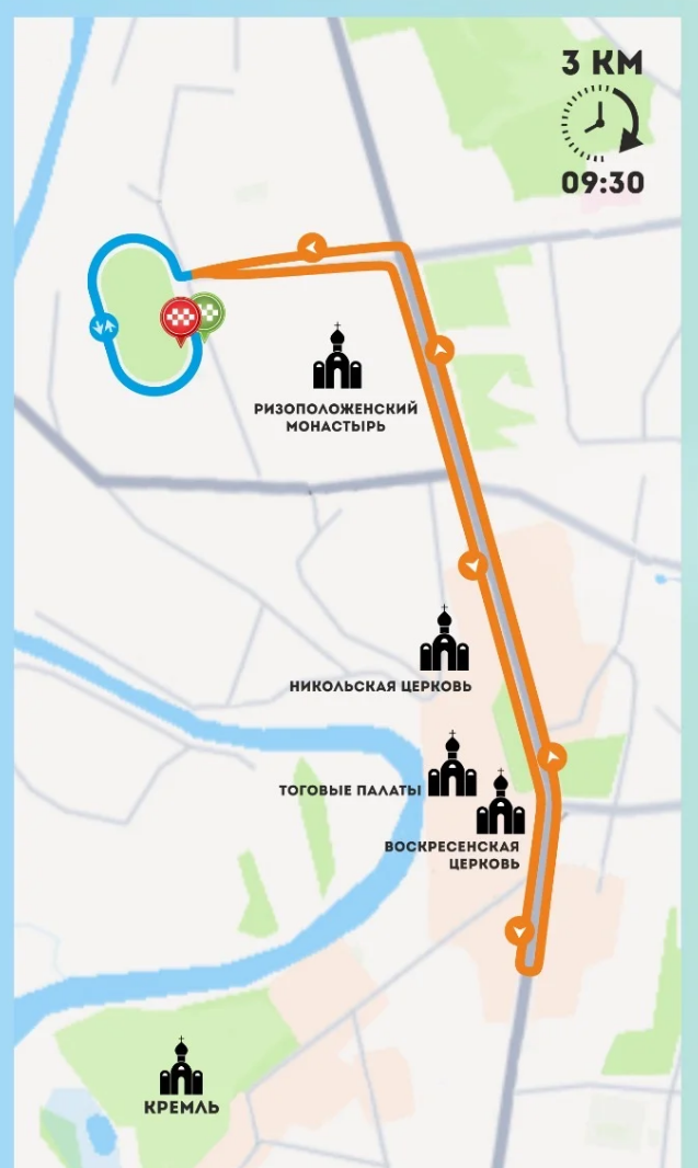 Приятный и быстрый старт по стадиону в сторону города. Дальше центральная улица города, где ты можешь любоваться достопримечательностями или уйти в результат и бежать. Развернуться и обратно – город, стадион и финиш. Отсечка – первый финиш после травмы, результат, медалька и самоанализ.