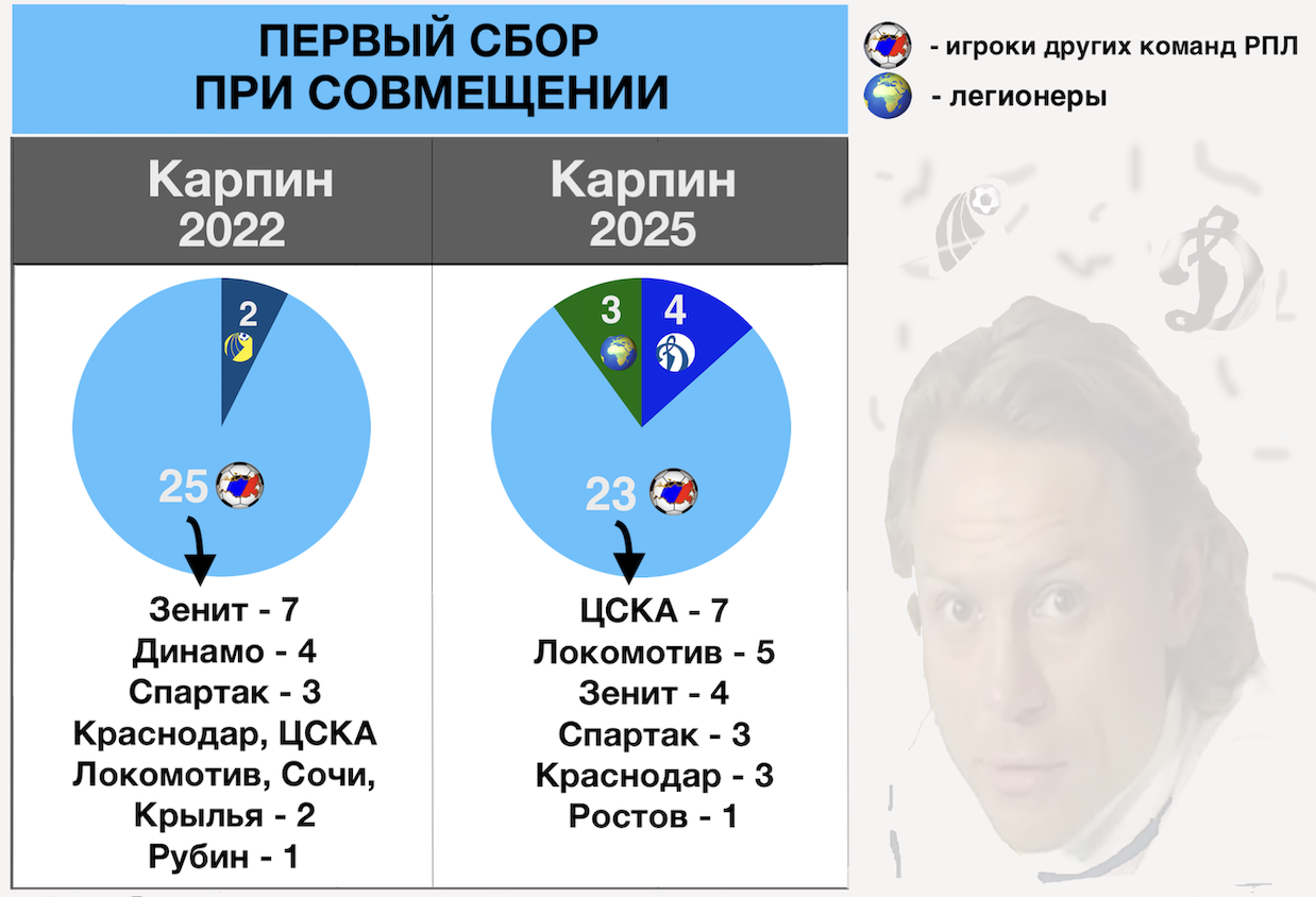 За год у «Наших парней» пять сборов - это полтора месяца! Недаром, по информации «РБ Спорт», «Зенит», «Спартак» и «Локо» ругали совмещение на собрании РПЛ. Аргументы: тревога за результаты сборной (похвально) и «несправедливое преимущество» для бело-голубых. Последний пункт не объяснялся. Может, беспокоились, что Карпин в отличие от коллег будет непрерывно работать с русским костяком «Динамо»? Вряд ли. Отъезды тренера и деление состава, наоборот, вредны.