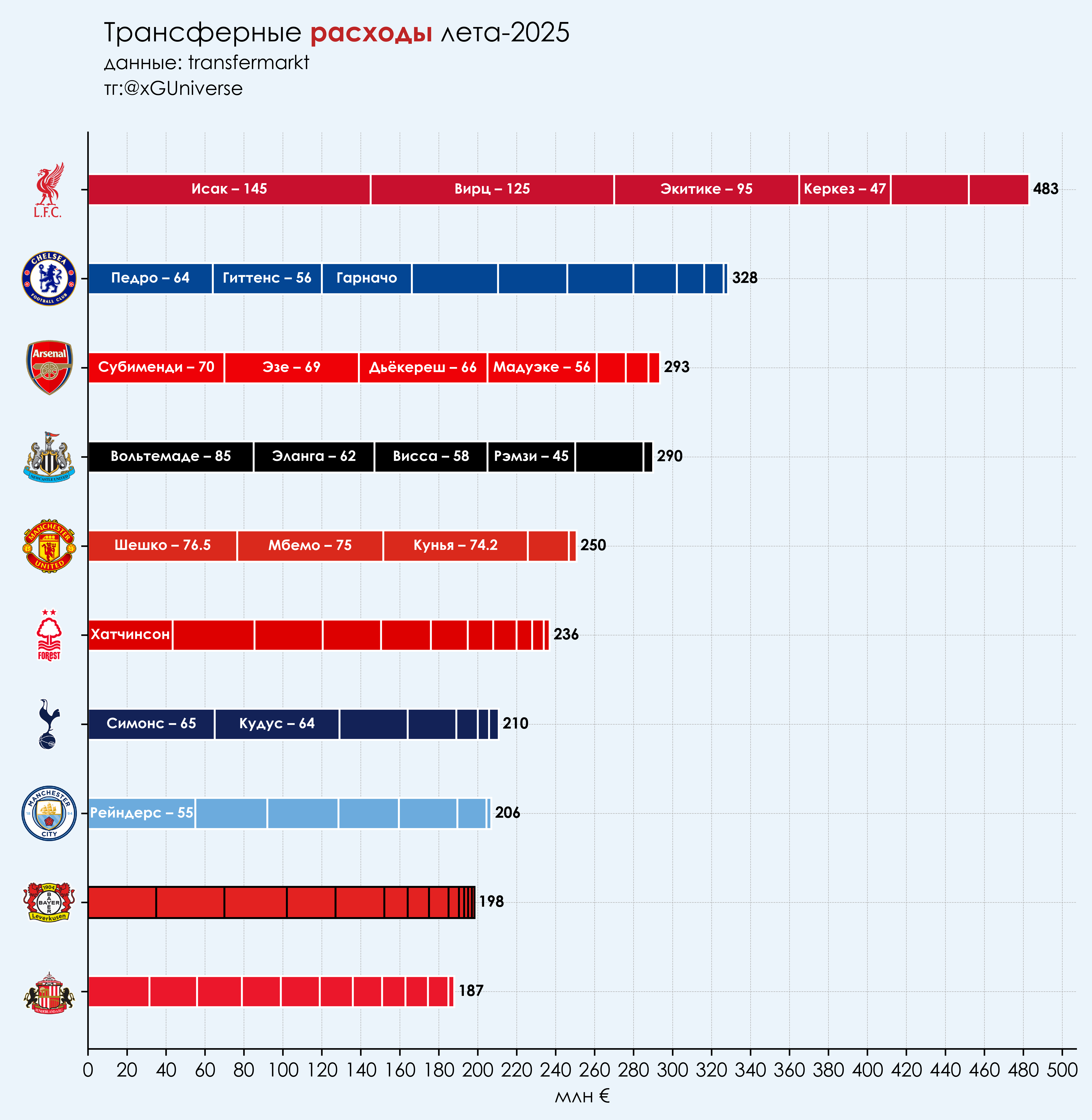 Здесь с гигантским отрывом лидирует «Ливерпуль» — за это лето клуб успел два раза побить рекорд самого дорогого трансфера АПЛ, но оформить трансфер Марка Гехи не успел, с ним у «красных» было бы больше полумиллиарда потраченных евро за лето. В итоге у «Ливерпуля» три самых дорогих трансфера этого лета — Исак, Вирц и Экитике.