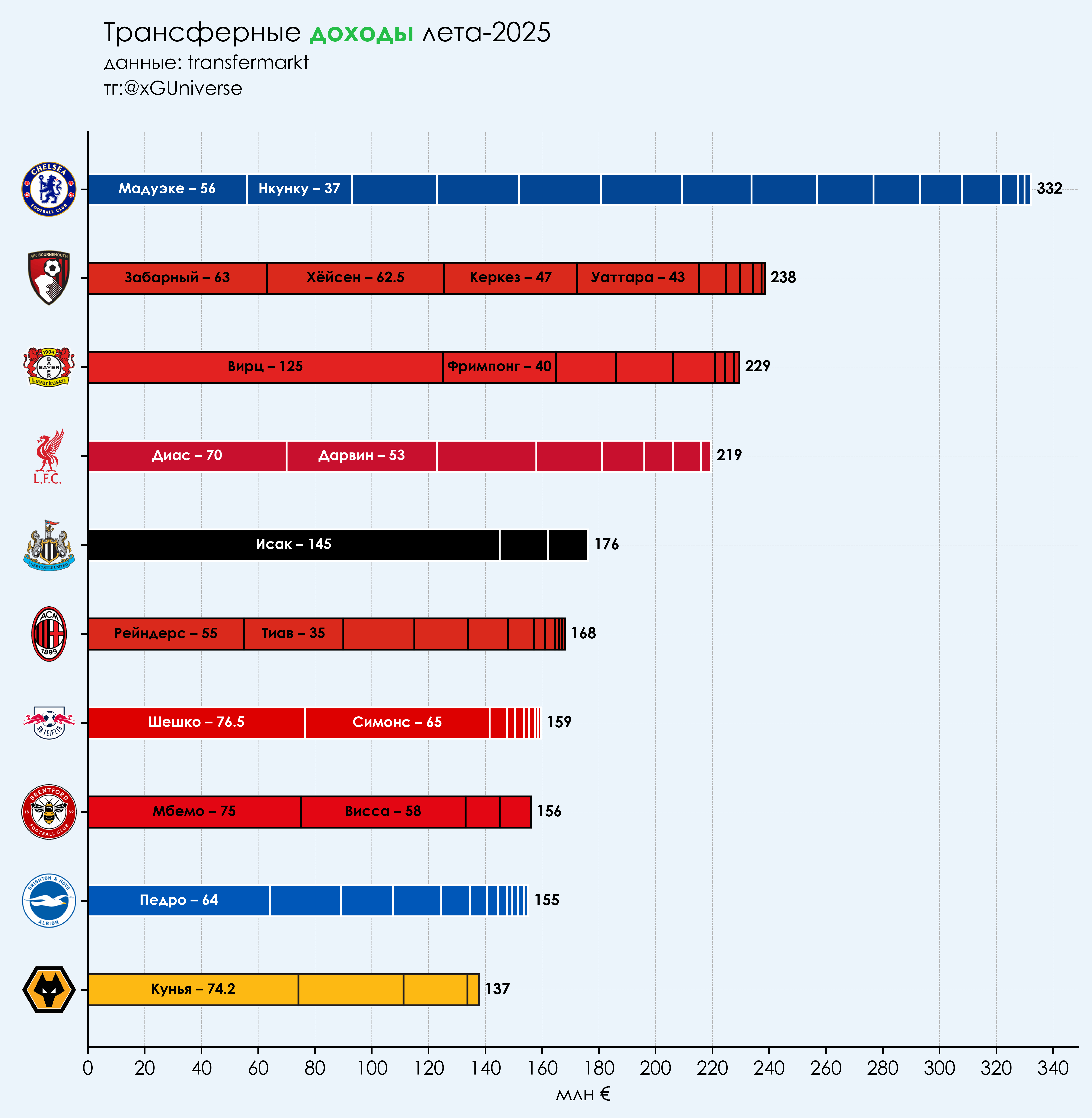 Благодаря трансферу в «Ливерпуль» Исак скакнул на четвертое место, к своим суммам плюсы также получили Жоау Феликс (за 30 млн в «Аль-Наср»), Альваро Мората и Матеус Кунья. Еще до трансфера Исака в десятке успели побывать Осимхен (183 млн) и Дарвин (184 млн).