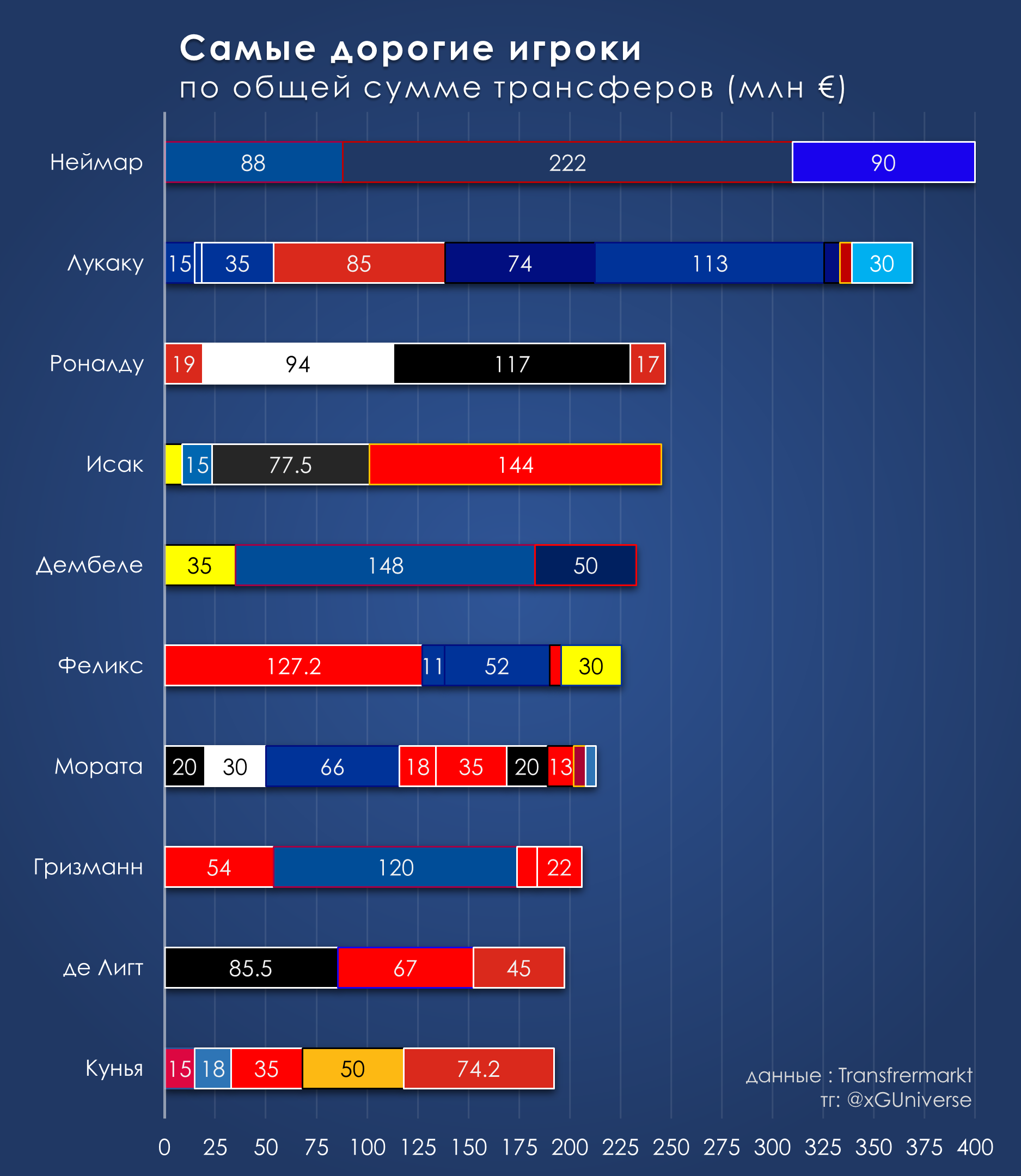 10 самых дорогих футболистов по сумме трансферов