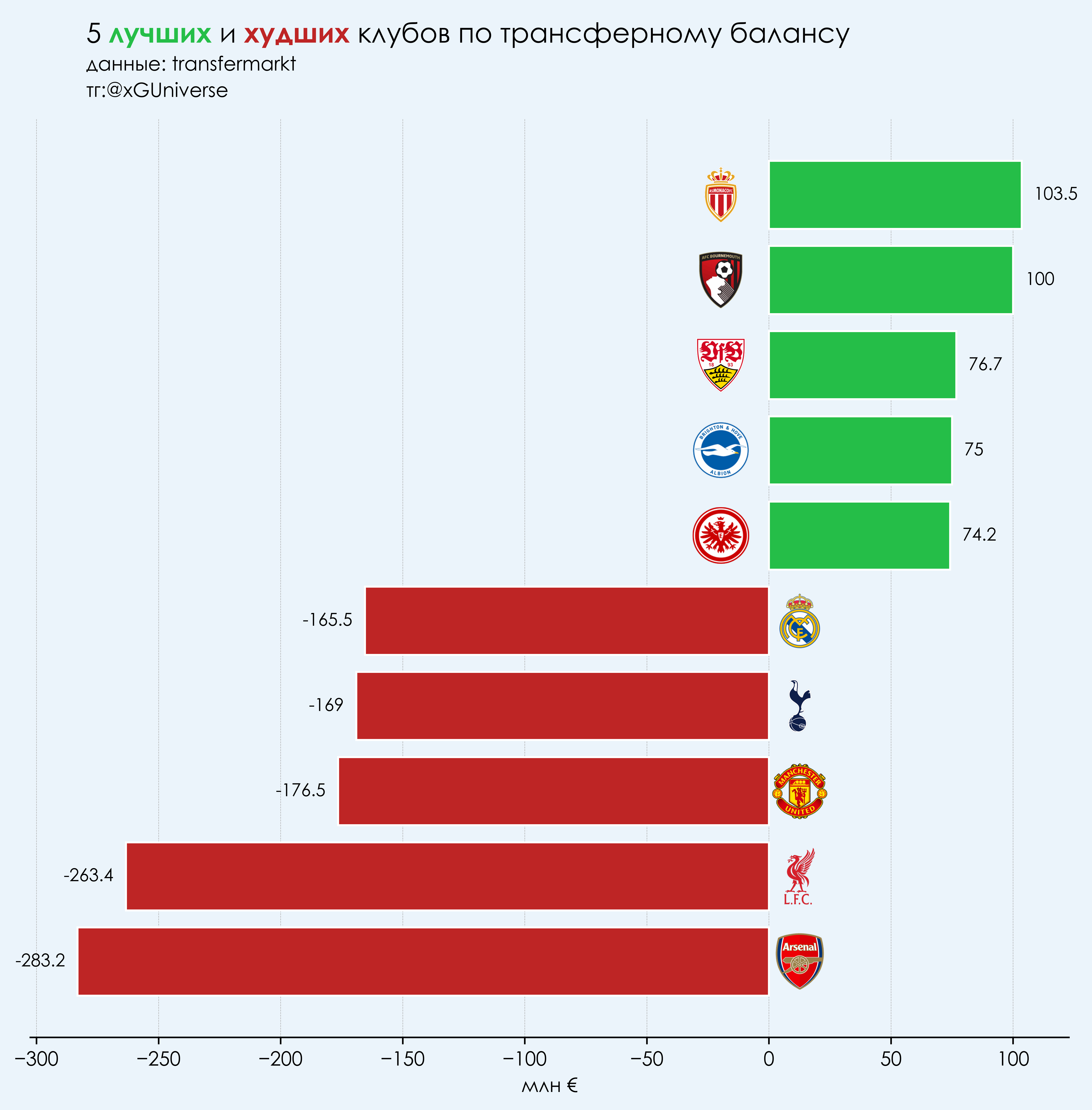 Самое интересное — посмотреть на чистый баланс. Здесь выделяется «Монако» (+103,5 млн) и «Штутгарт» (+76,7млн), сумевшие продать на большие суммы и при этом удержаться от крупных покупок.
