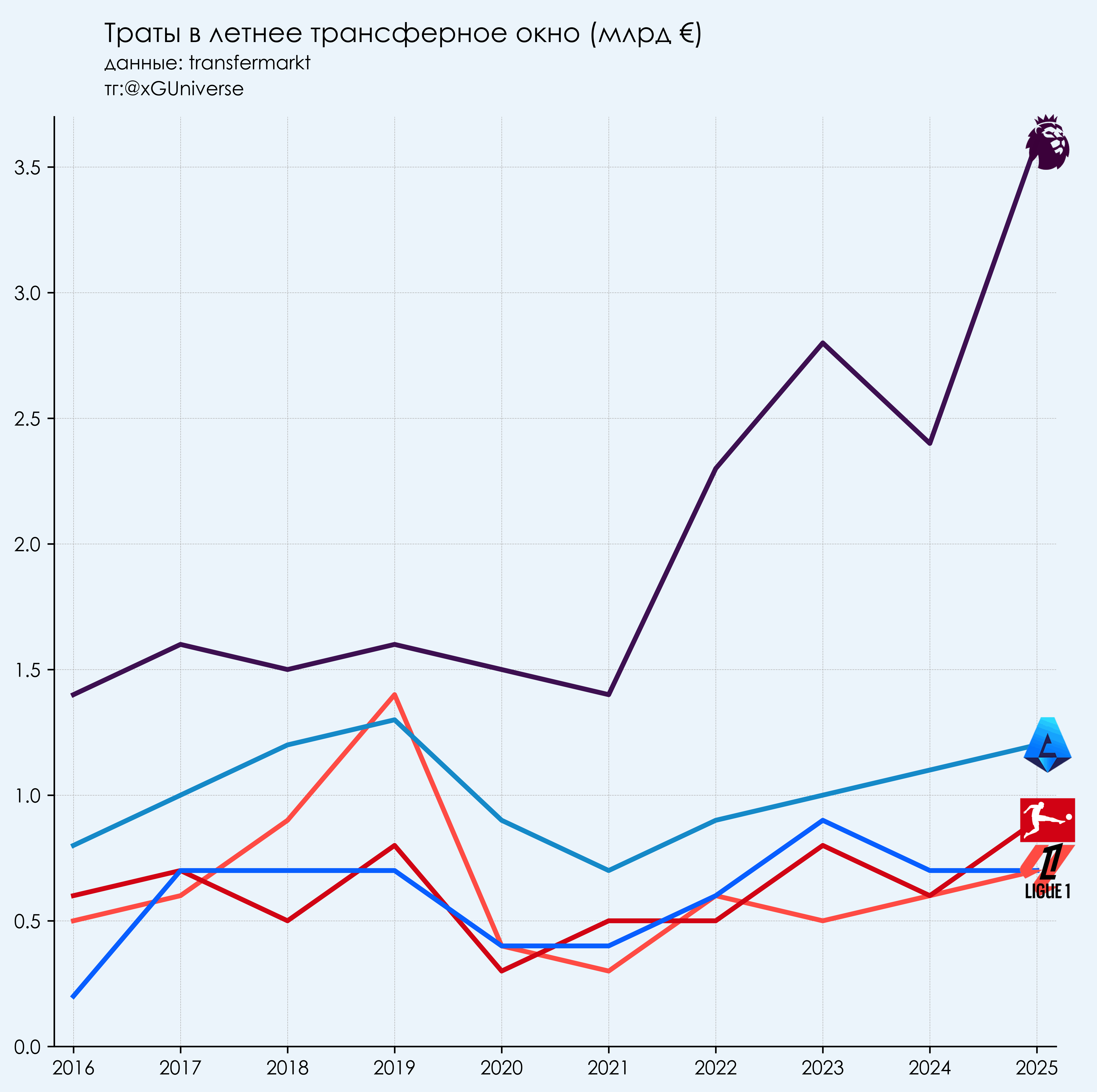 На графике видно, как пандемия ударила по рынку, но после 2021 года траты снова растут, а в последние годы у Серии А, Бундеслиги и Ла Лиги наблюдается рост. Но их цифры, конечно, не идут ни в какое сравнение с АПЛ.