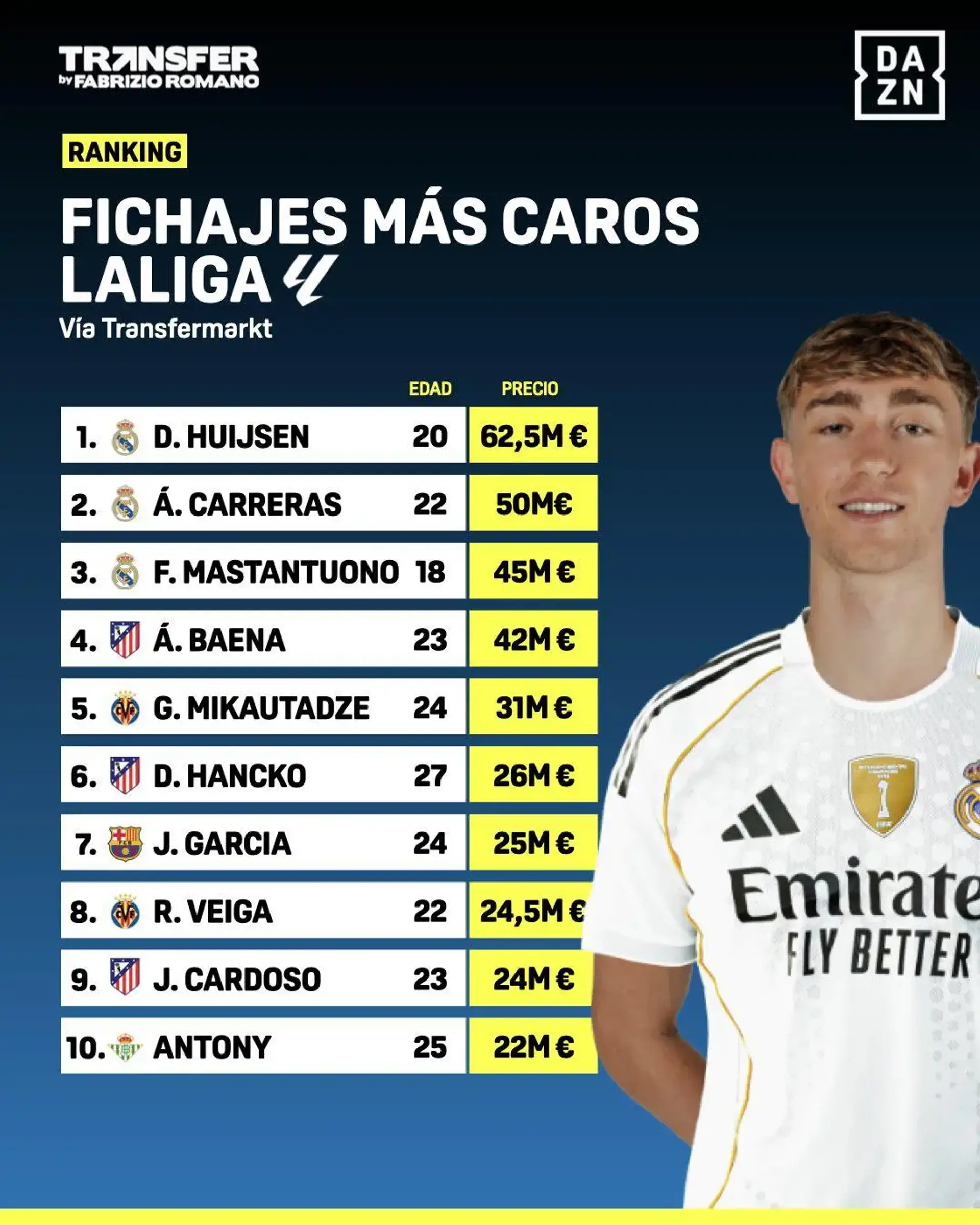 Летнее окно 2025 в Испании выдалось ярким, но главные рекорды побил «Реал». Сразу три первых места в десятке самых дорогих переходов — за мадридцами.