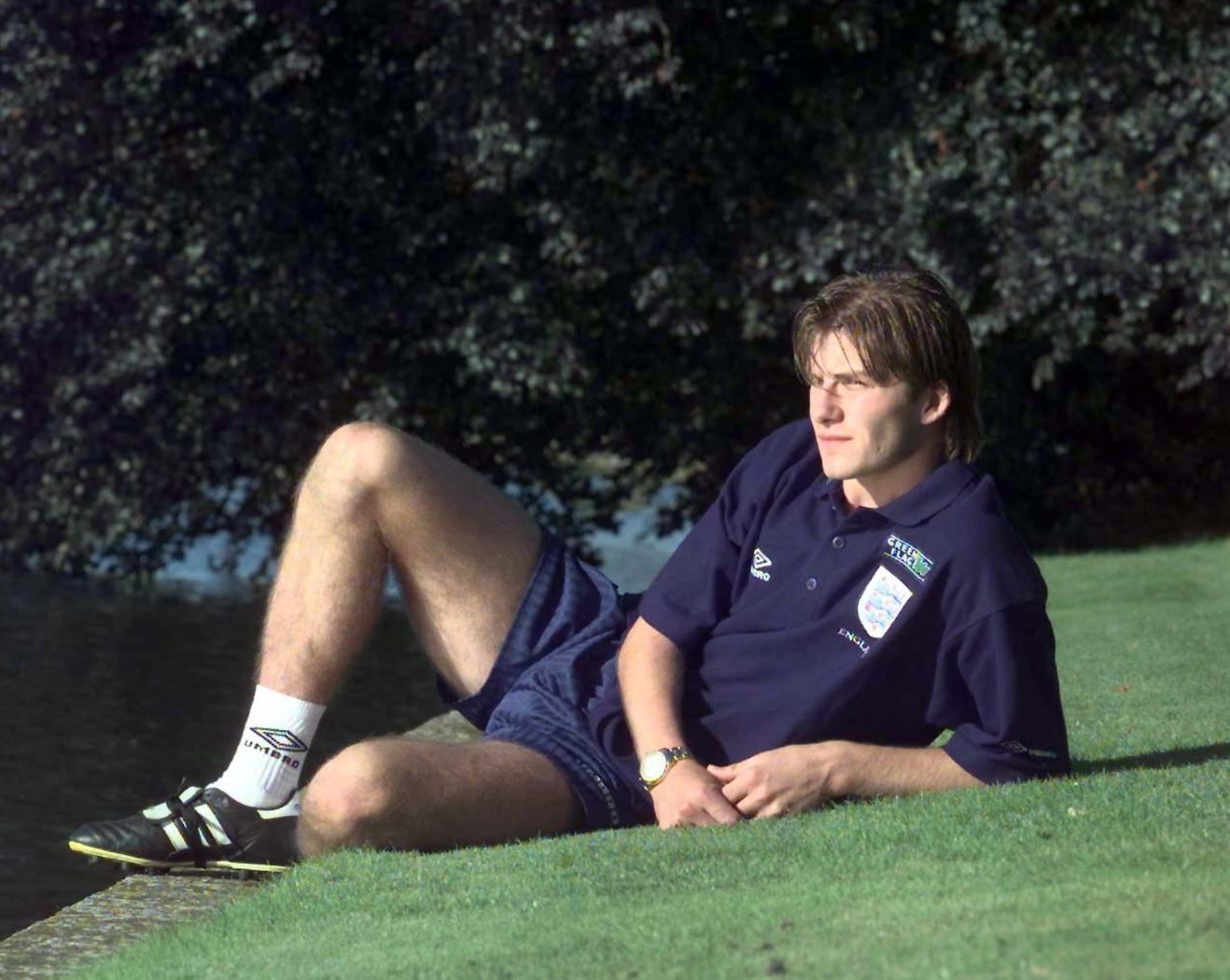 Бекхэм, не скрывая усталости, отдыхает после тренировки сборной Англии в аббатстве Бишам, Марлоу, Бакингемшир.