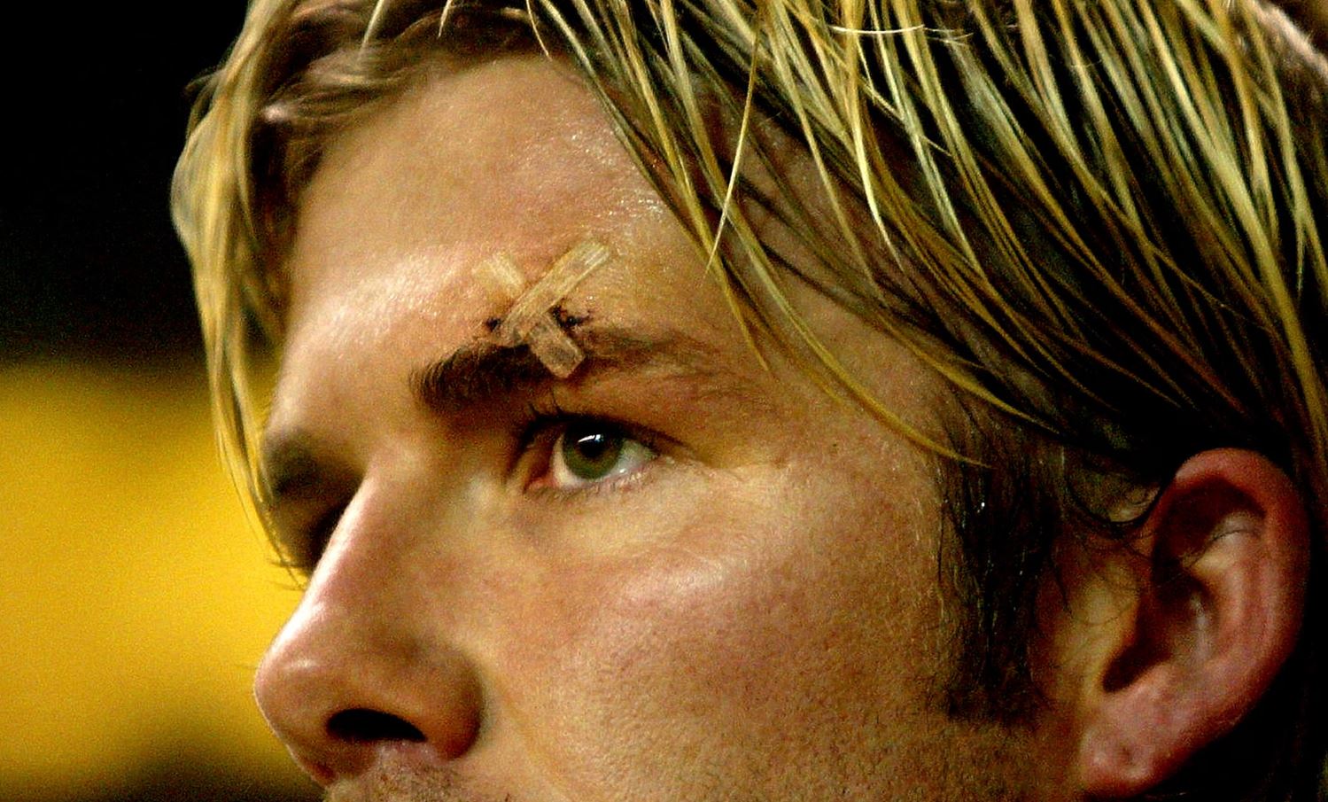 Бекхэм с небольшим шрамом над глазом во время матча группового этапа Лиги чемпионов между «Манчестер Юнайтед» и «Ювентусом» в феврале 2003 года.