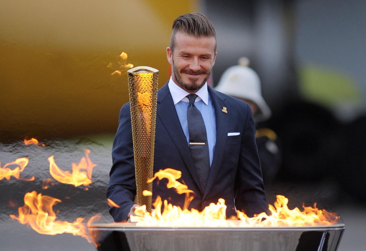 Бекхэм на церемонии прибытия олимпийского огня на базу RNAS Culdrose в Корнуолле в мае 2012 года — один из этапов турне огня по Великобритании перед открытием Олимпиады в июле.