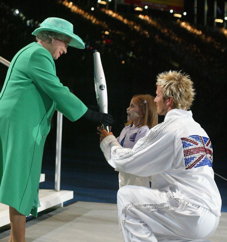 Бекхэм и шестилетняя Кирсти Ховард вручают юбилейную эстафетную палочку королеве Елизавете II после её финального этапа на стадионе «Сити оф Манчестер» во время церемонии открытия Игр Содружества 2002 года.