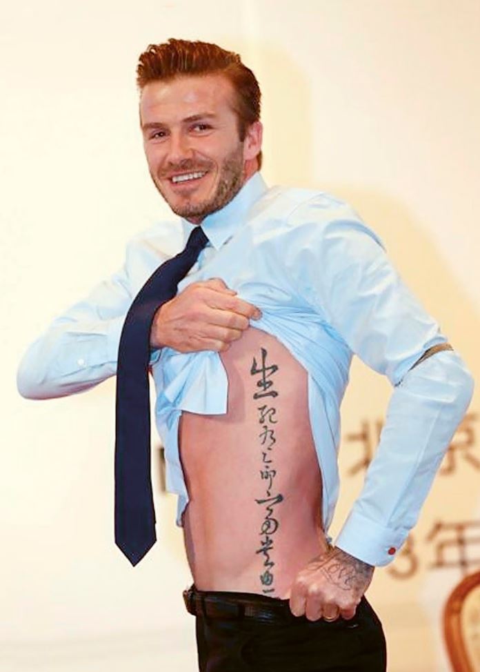 Бекхэм демонстрирует свои многочисленные татуировки с китайскими иероглифами в Пекинском университете во время визита в Китай в роли посла китайской Суперлиги.