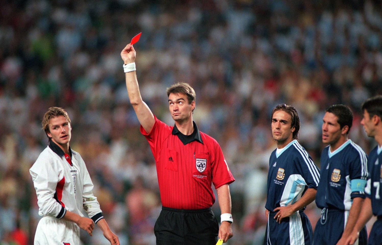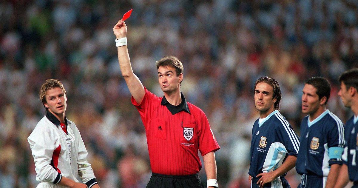 В порыве эмоций на чемпионате мира 1998 года Бекхэм получил красную карточку в матче Англии против Аргентины за то, что ударил ногой Диего Симеоне. В итоге Аргентина одержала победу в серии пенальти со счётом 4:3.