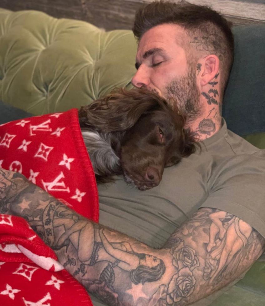 Бекхэм снова запечатлён спящим — теперь уже вместе со своей собакой, уютно укутанной в одеяло Louis Vuitton x Supreme.