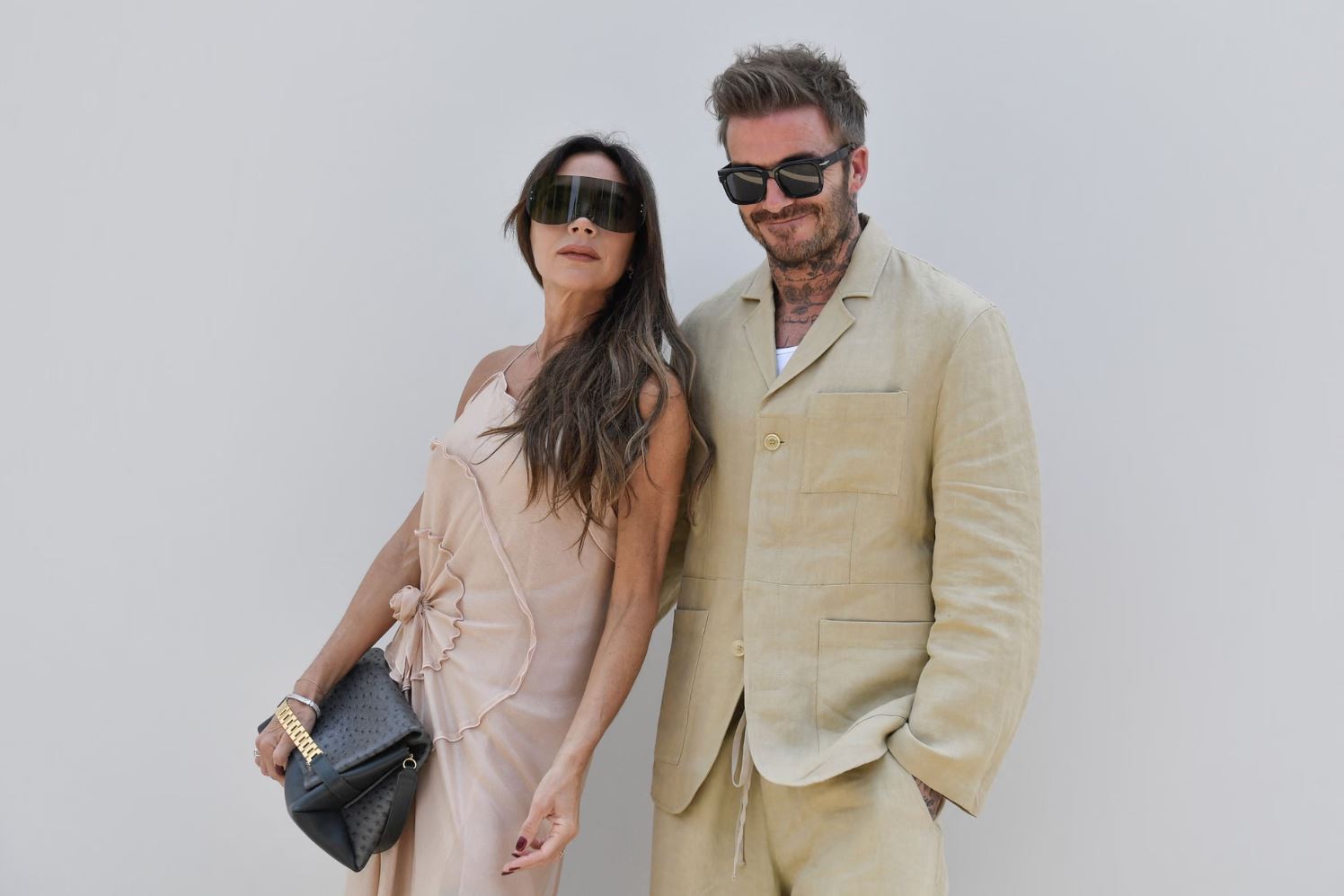 Дэвид и Виктория позируют фотографам по прибытии на показ мужской коллекции Jacquemus S24 на Неделе моды в Париже, проходившей во дворце Версаль.