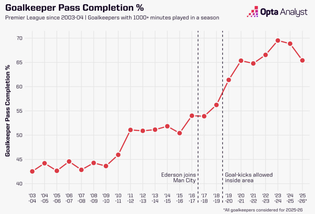 Изменение правил, введённое перед стартом сезона 2019/20, разрешившее принимать пас при выносе от ворот внутри своей штрафной площади, также оказало значительное влияние, но игра уже двигалась в этом направлении. Рост процента точных передач у вратарей красноречиво это подтверждает.