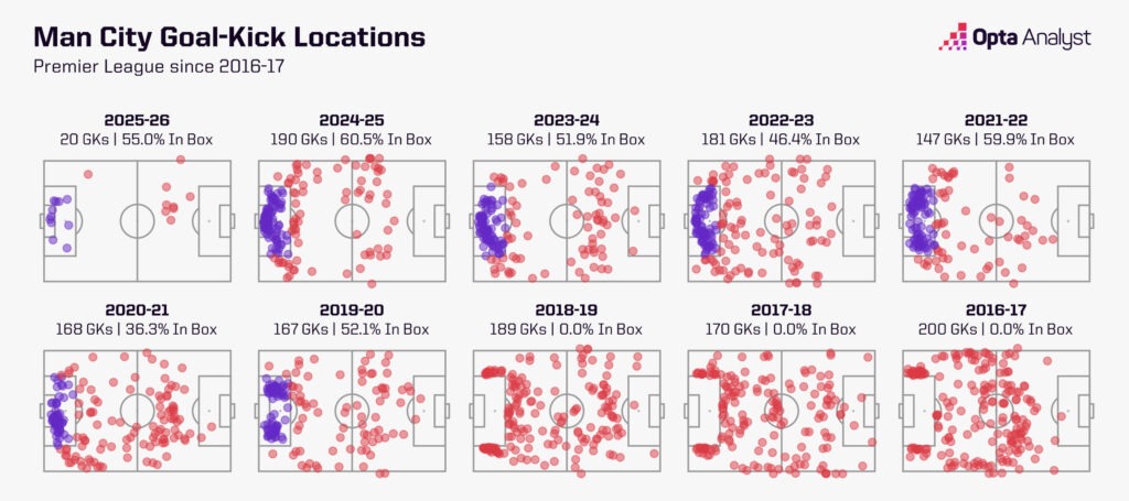 Таким образом, не имея возможности заменить одновременно и пас Эдерсона, и его способность отражать удары, Гвардиола вполне разумно решил воспользоваться возможностью подписать одного из лучших «сэйверов» своего поколения. Это может изменить стиль игры «Сити», но футбол в любом случае движется в этом направлении. Позади всего лишь три тура сезона 2024/25, но впервые за 10 лет доля выносов от ворот в Премьер-лиге, ушедших на половину поля соперника, увеличилась. И увеличилась весьма существенно.