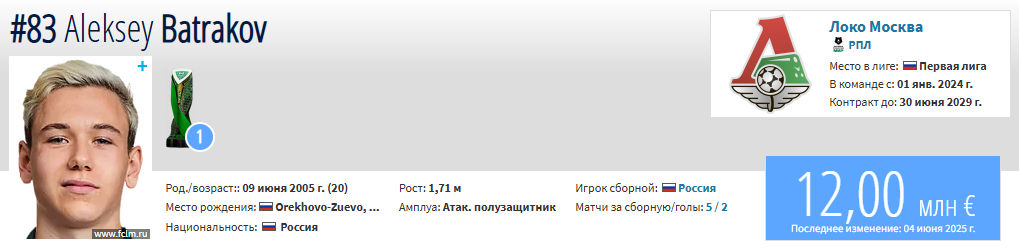 С каждым матчей Батраков становится увереннее, активнее и полезнее для команды. Да, до статуса «суперзвезды» ещё далеко, но для Локо Батраков уже играет важную роль. И это радует как болельщиков клуба, так и тех, кто не поддерживает Локомотив. Ведь в нашей стране уже давно не было молодого игрока подобного класса. Странно, что его стоимость не выше, ведь в Европе молодые игроки, которые так хорошо себя показывают, оцениваются куда дороже. Но ничего страшного — спишем это на скептическое отношение европейцев к РПЛ.