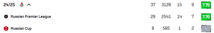 Прошлый сезон для Алексея фактически стал первым полноценным на взрослом уровне, и он провёл его впечатляюще: 29 сыгранных матчей в чемпионате, 14 забитых мячей и 7 голевых передач. В Кубке России показатели были скромнее — 8 матчей, 1 гол и 2 голевые передачи, но и там он оставался полезным игроком для команды.