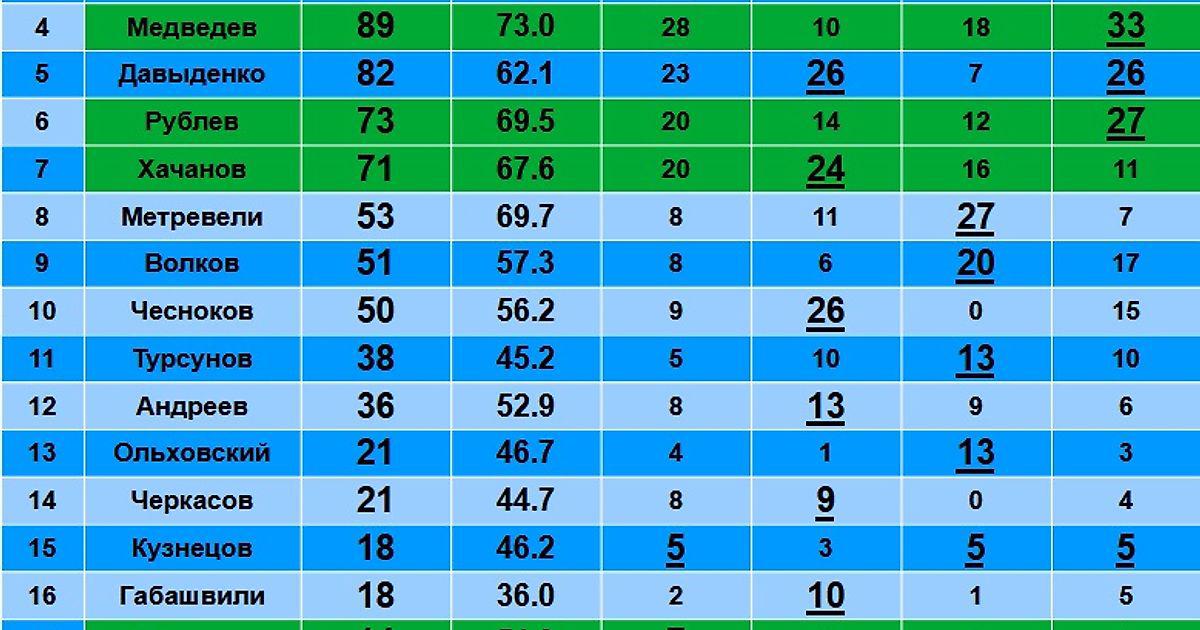 Зато, в топ-8 лучших выступлений, три принадлежат Медведеву и Рублеву.