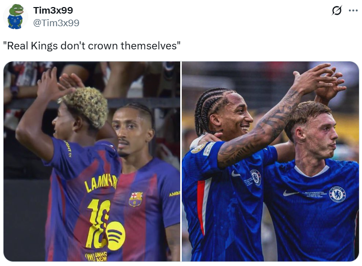 Болельщики с подписью «настоящие короли не коронуют себя сами» постят фотографии игроков, надевающих невидимую корону на своих партнеров.