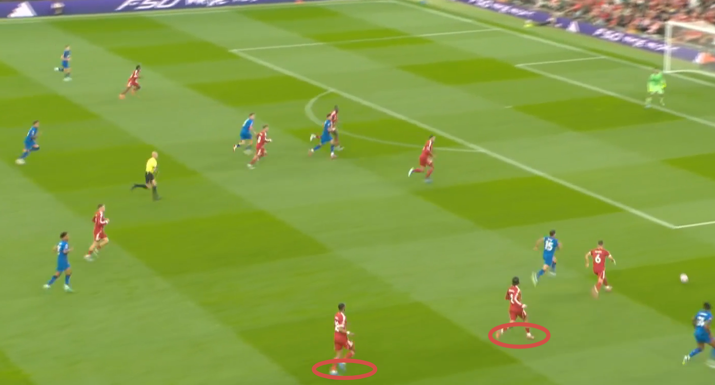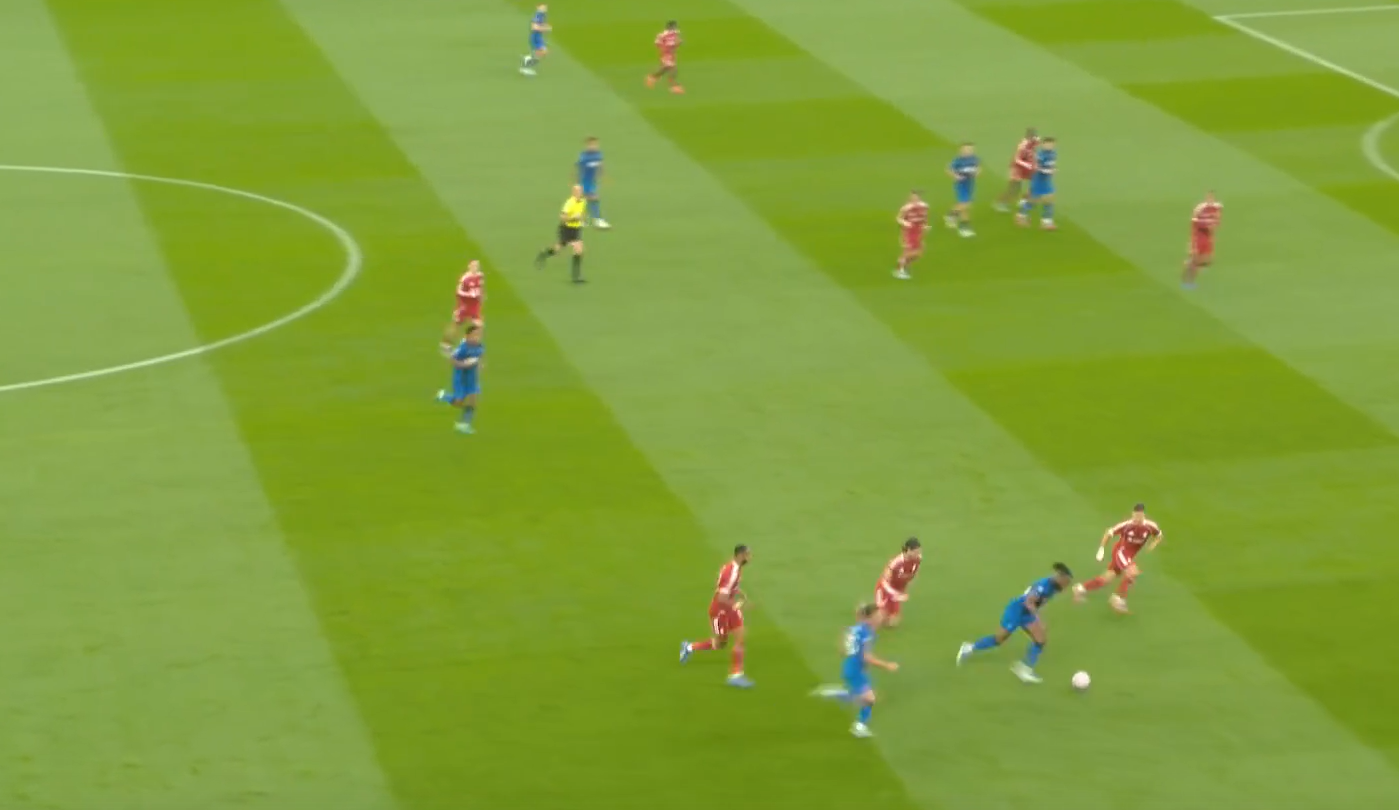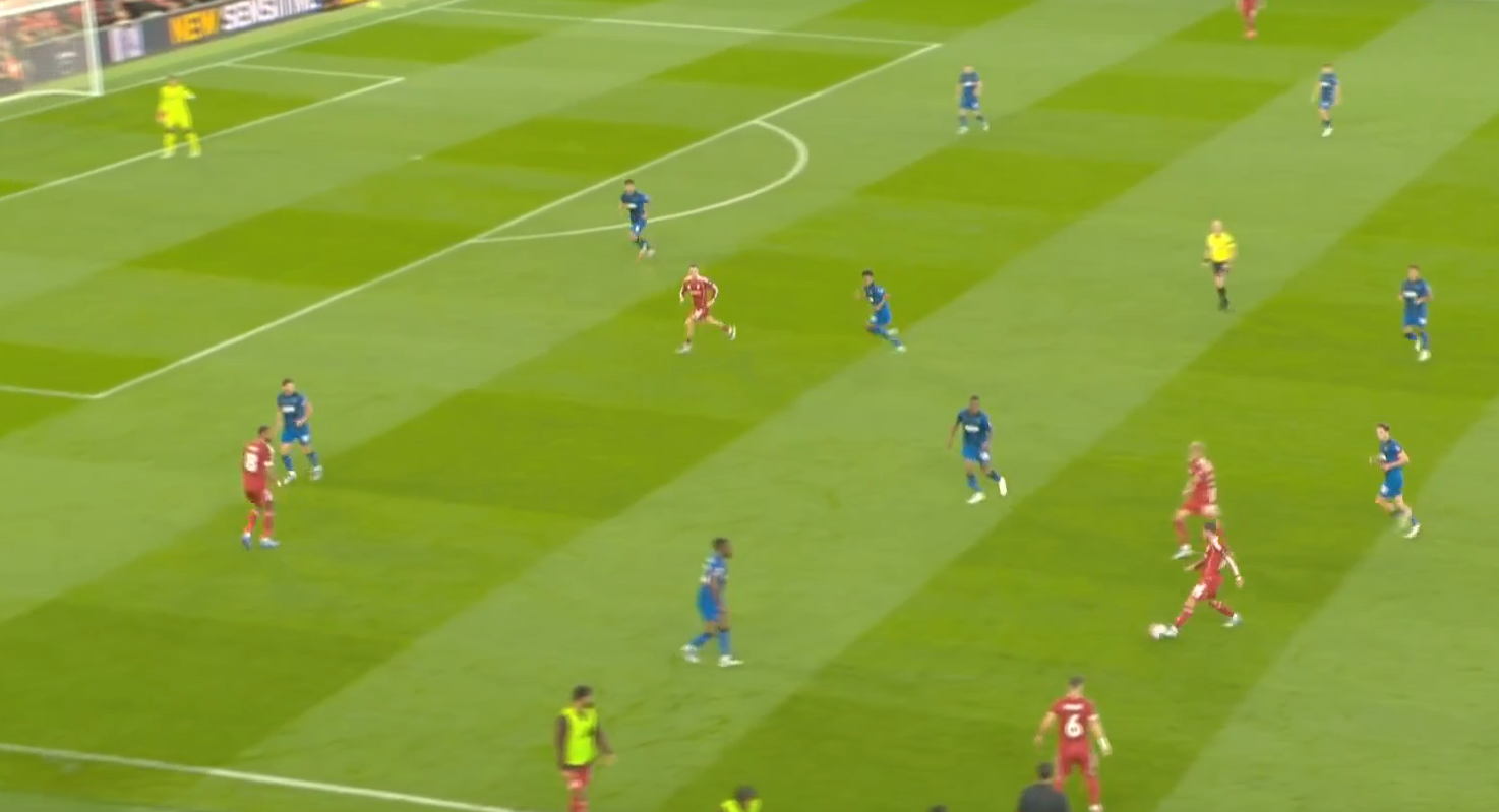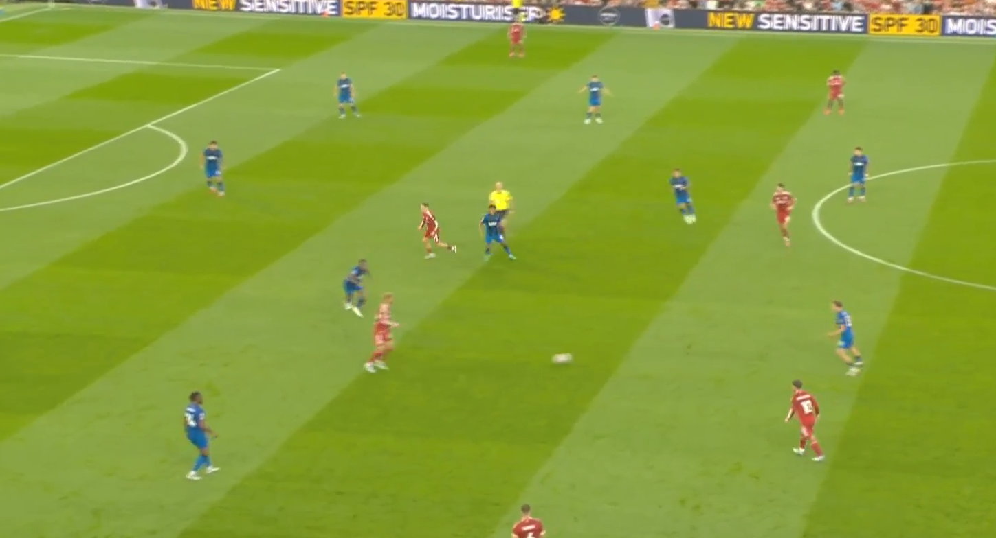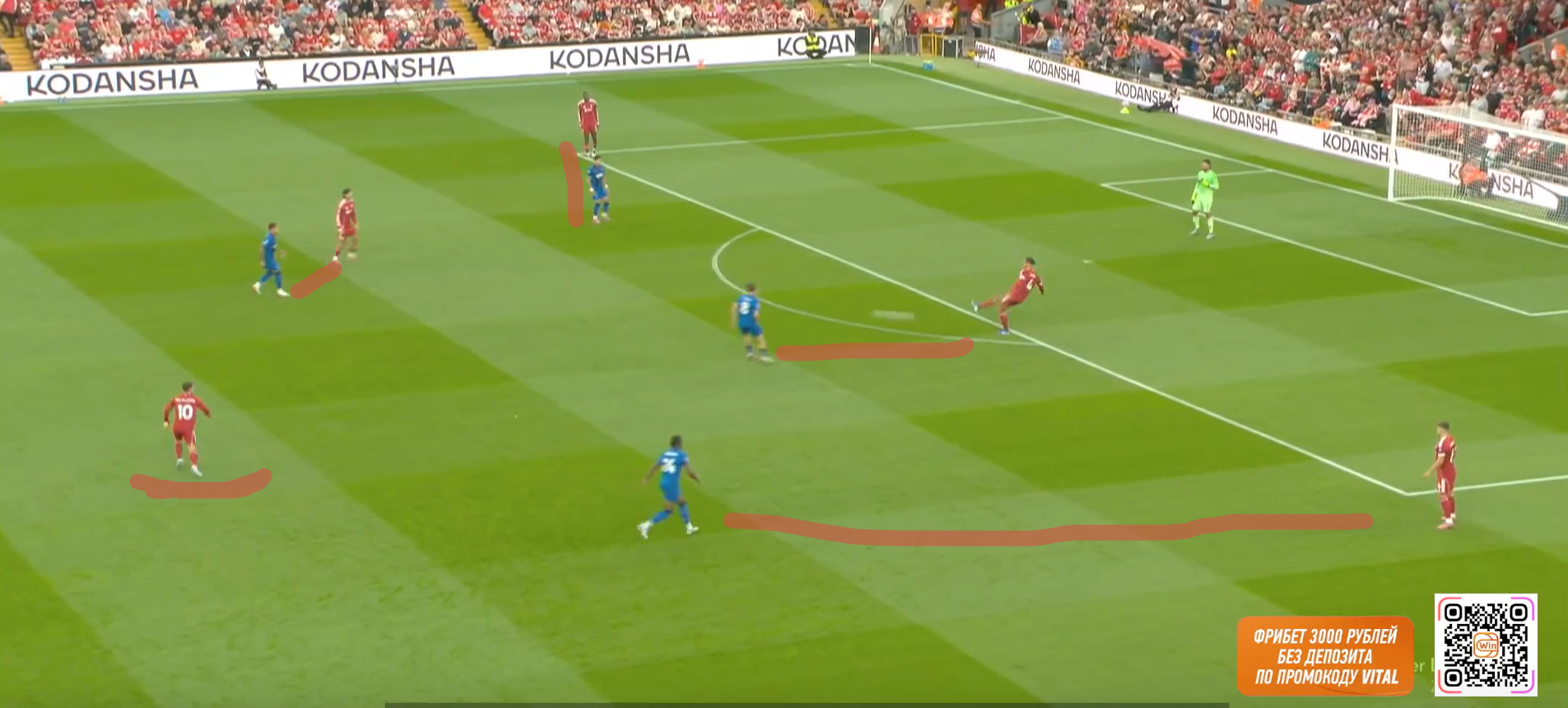 Второй мяч «Ливерпуля» начинается с «открытого мяча» Керкеша, при этом столько игроков держат коридор для передачи. Диаките хорошо видит движение Экитике (который в свою очередь отлично находит зону), но встречает его изначально на прямых ногах, а потом дает принять, обработать и развернуться. Скотт, Адамс и Смит не держат внутренний коридор (очередной разрыв между защитой, которая очень низко садится, и полузащитой в 14-ой зоне). Также «отличные» оборонительные навыки Тавернье, который выбрасывается на соперника, а затем начинает движение с прямых ног.