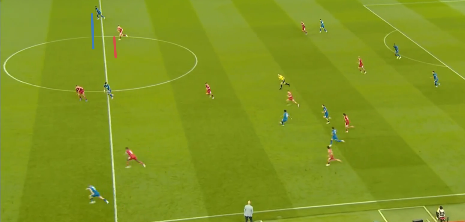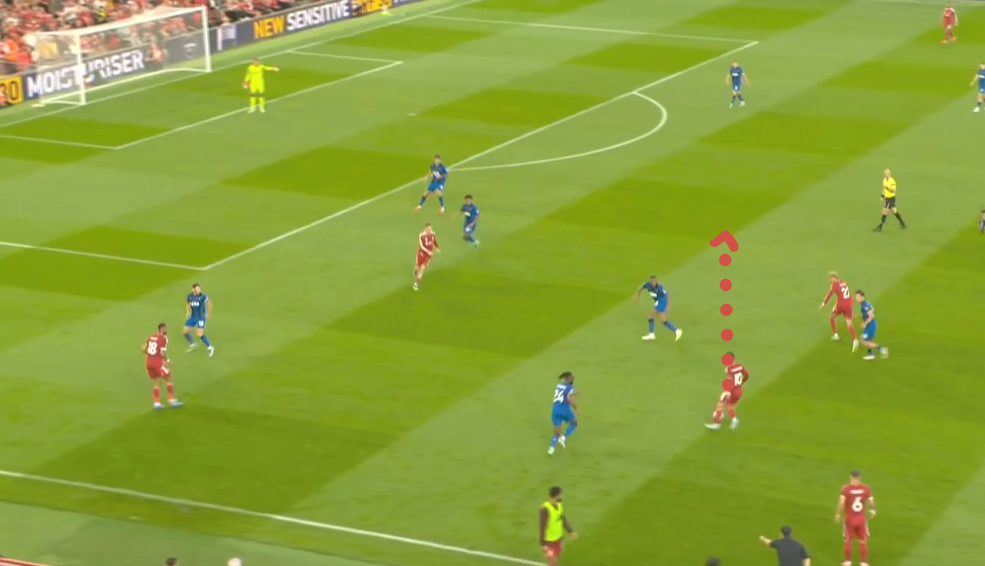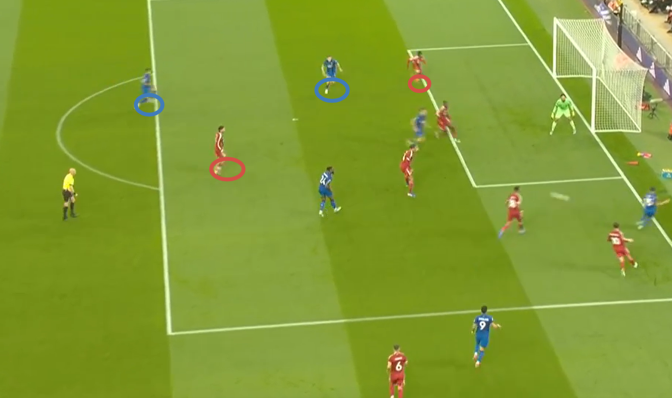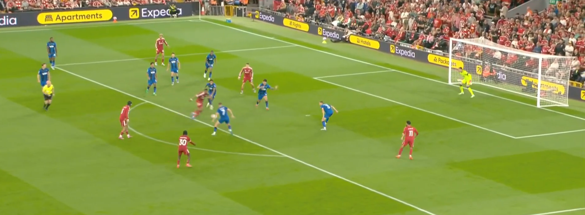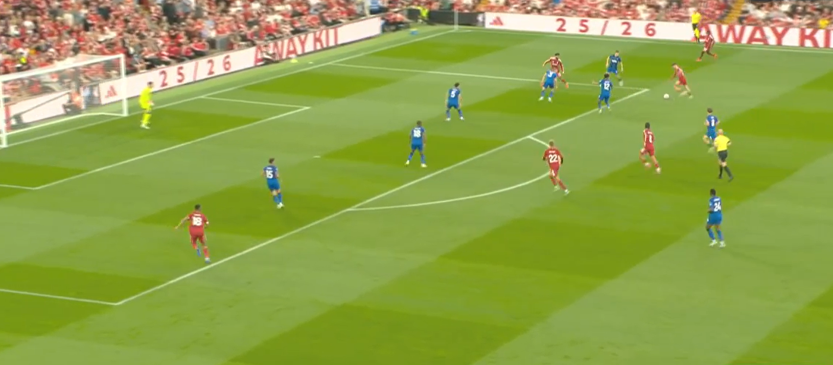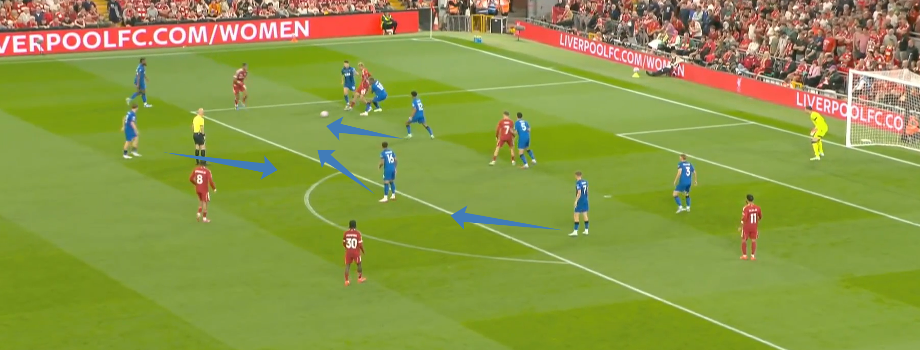 Второй мяч «Ливерпуля» начинается с «открытого мяча» Керкеша, при этом столько игроков держат коридор для передачи. Диаките хорошо видит движение Экитике (который в свою очередь отлично находит зону), но встречает его изначально на прямых ногах, а потом дает принять, обработать и развернуться. Скотт, Адамс и Смит не держат внутренний коридор (очередной разрыв между защитой, которая очень низко садится, и полузащитой в 14-ой зоне). Также «отличные» оборонительные навыки Тавернье, который выбрасывается на соперника, а затем начинает движение с прямых ног.