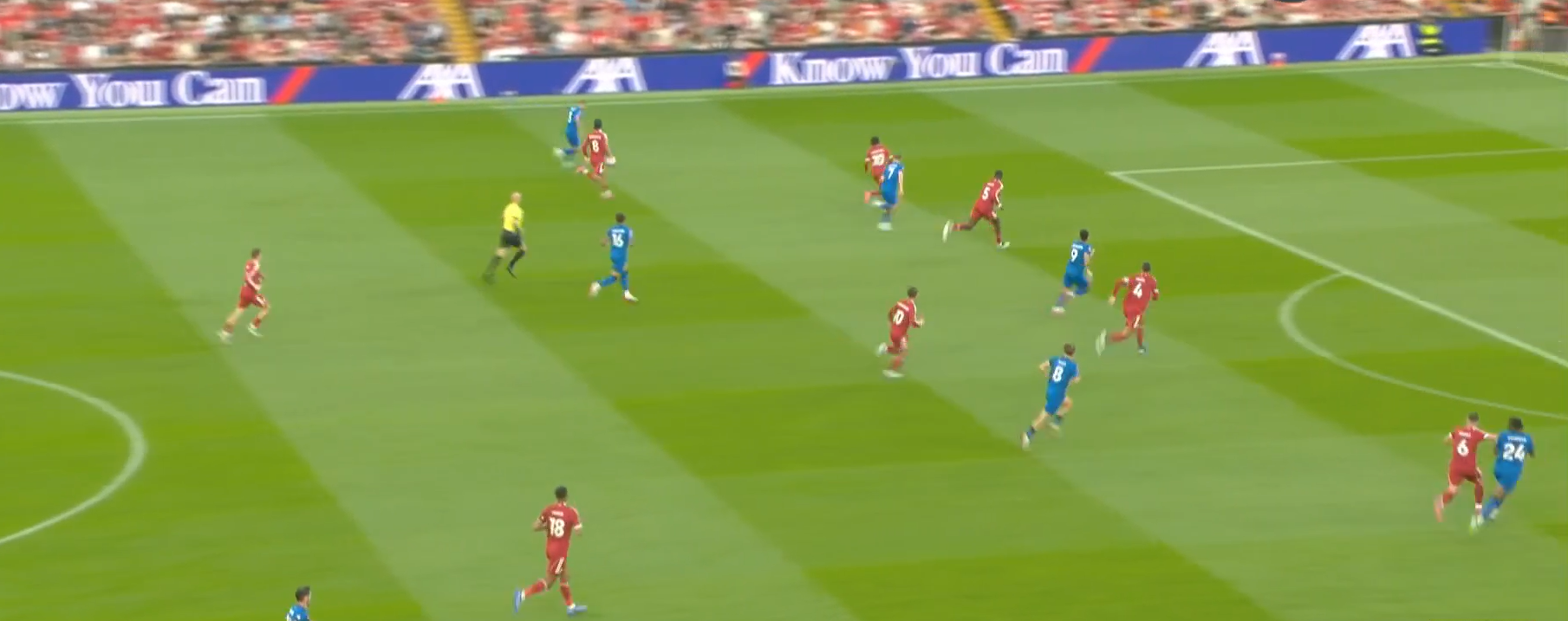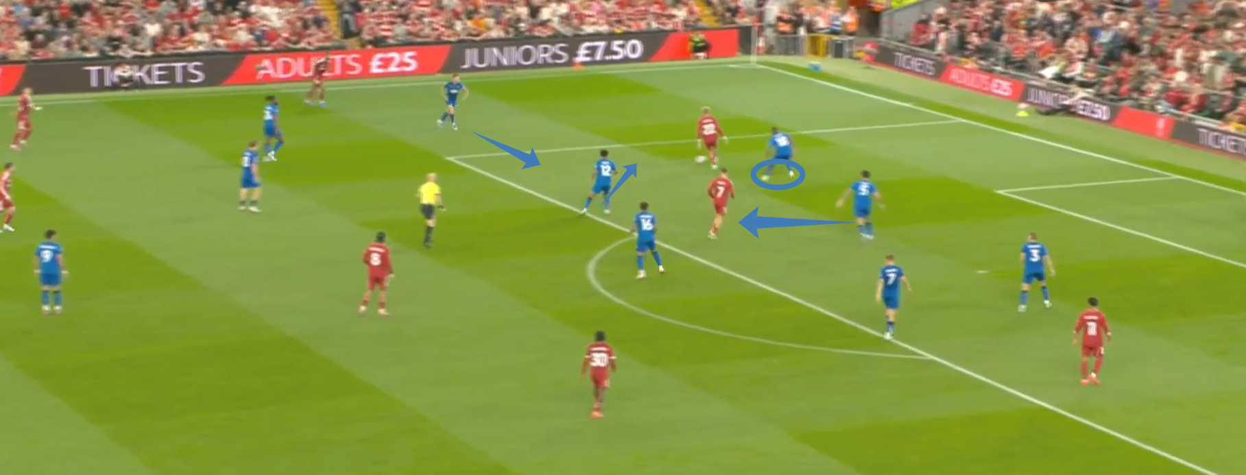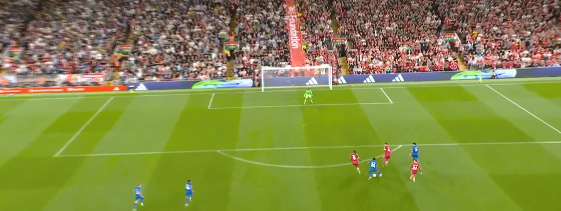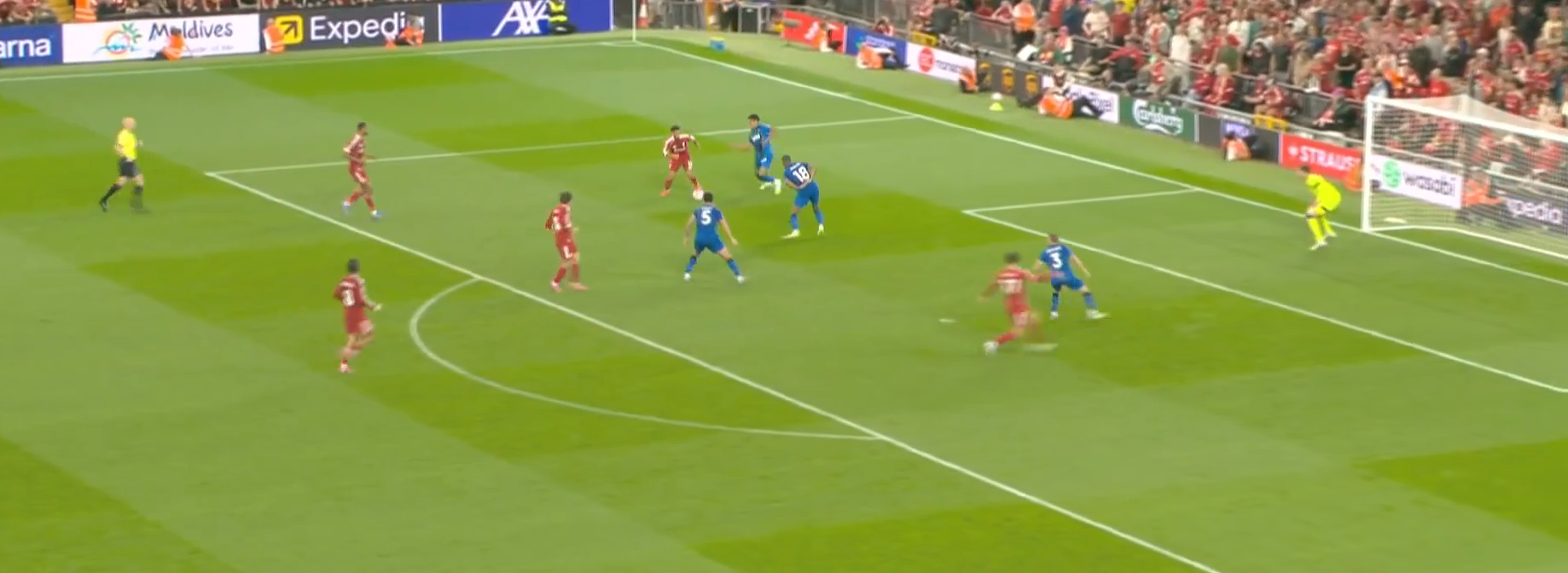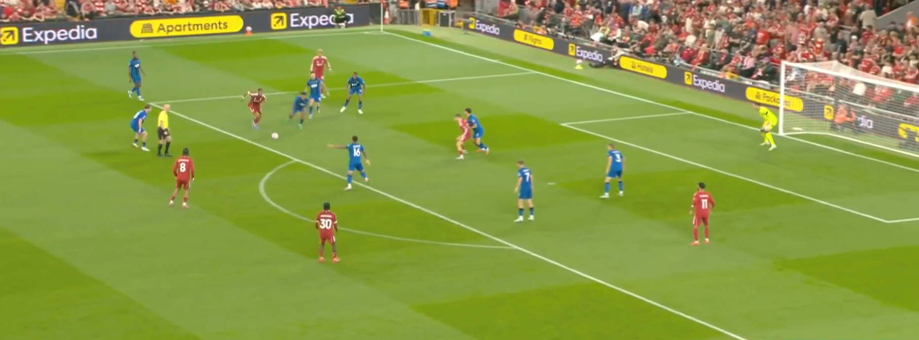 Второй мяч «Ливерпуля» начинается с «открытого мяча» Керкеша, при этом столько игроков держат коридор для передачи. Диаките хорошо видит движение Экитике (который в свою очередь отлично находит зону), но встречает его изначально на прямых ногах, а потом дает принять, обработать и развернуться. Скотт, Адамс и Смит не держат внутренний коридор (очередной разрыв между защитой, которая очень низко садится, и полузащитой в 14-ой зоне). Также «отличные» оборонительные навыки Тавернье, который выбрасывается на соперника, а затем начинает движение с прямых ног.
