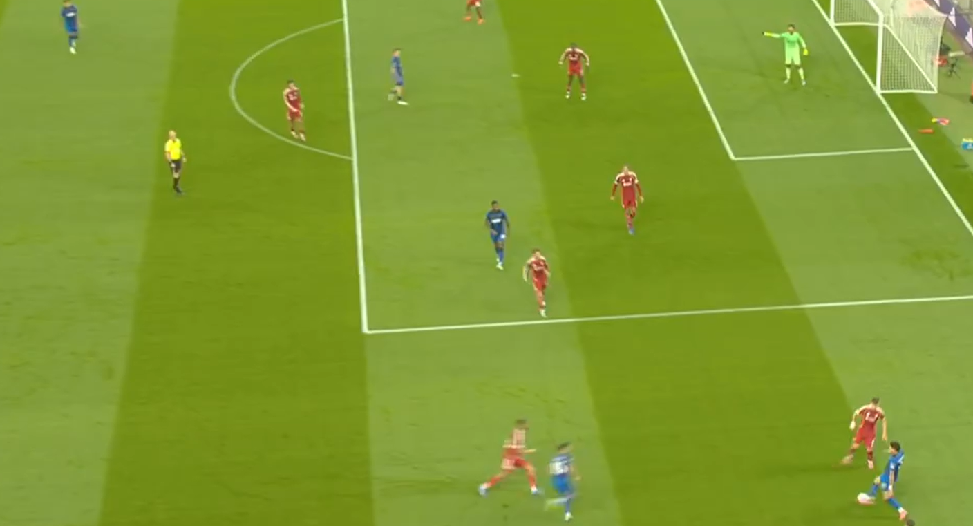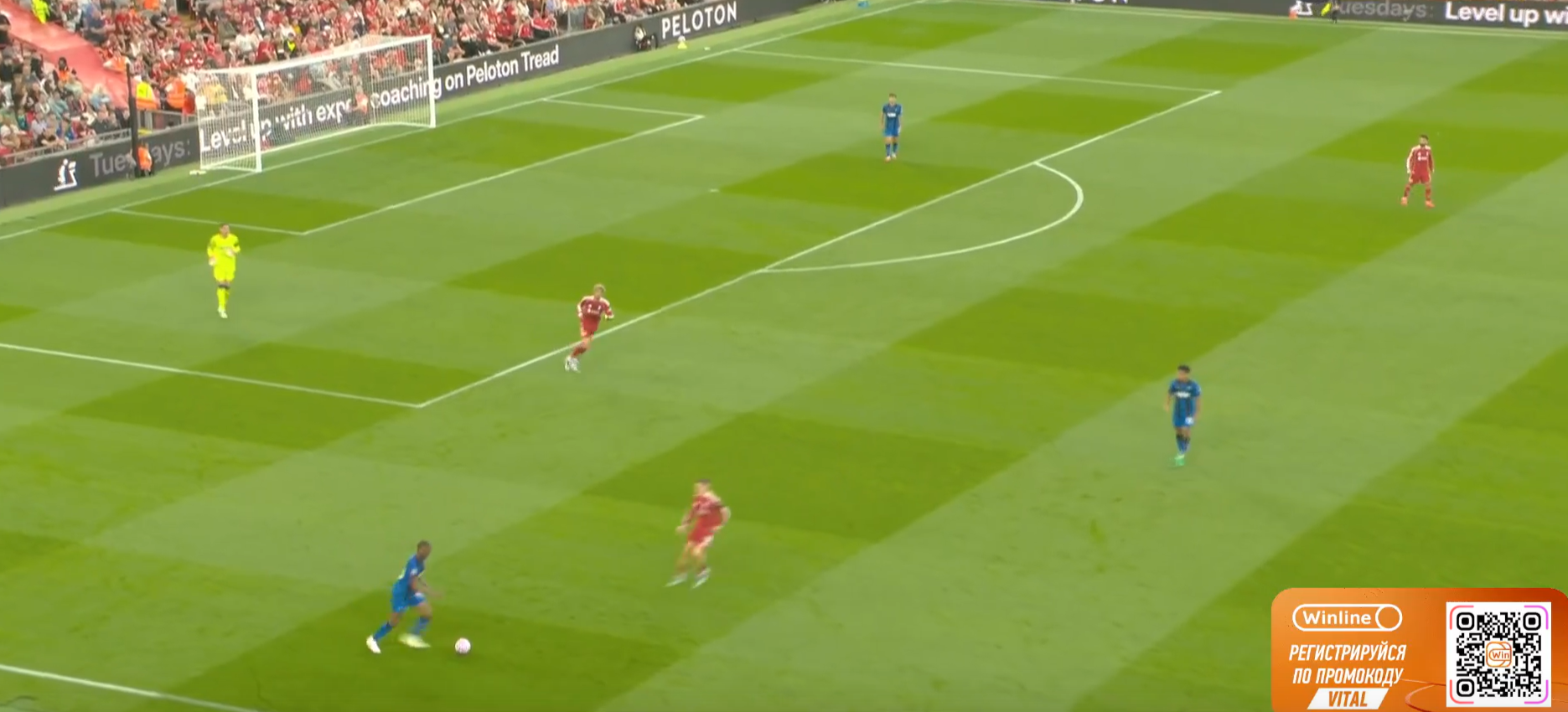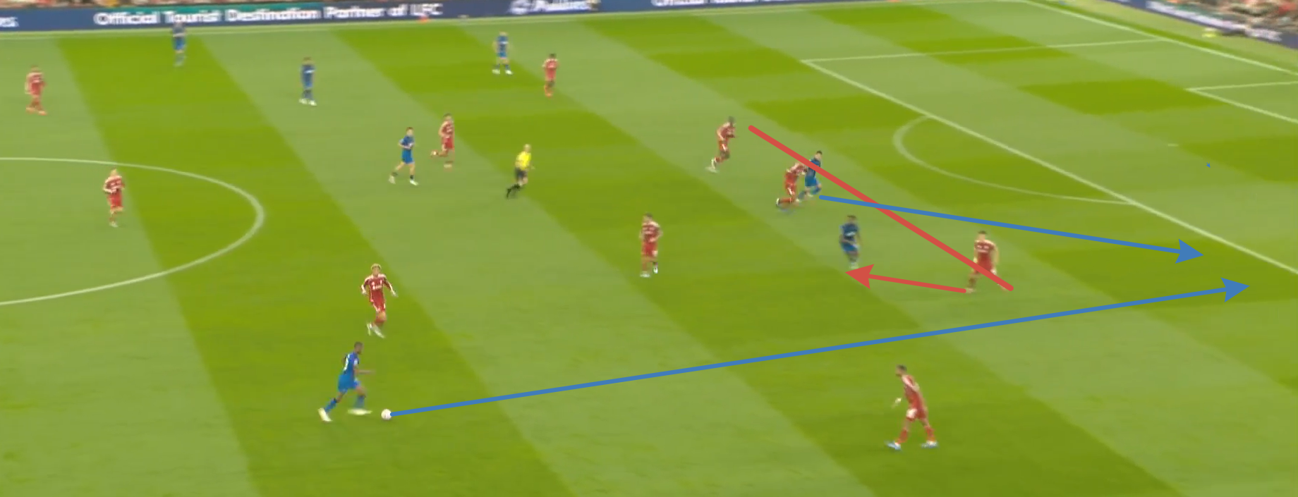 - Иным сценарием атаки была резкая смена фланга атаки длинной передачей на Салаха, располагающегося в широкой позиции в изоляции 1 в 1 с фланговым защитником соперника, и последующим забеганием Фримпонга во внутренний коридор.