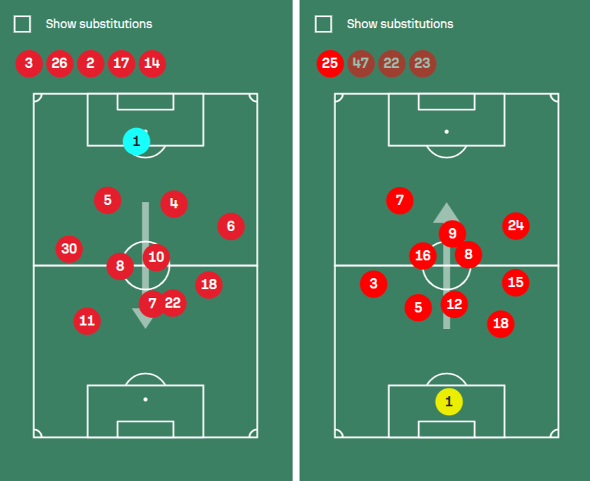 - «Ливерпуль» в таком сочетании уязвим при позиционной обороне на своей трети поля (допустил 8 deep-передач и постоянные потери в правом полуфланге игрока). Также не лучшие оборонительные навыки у фланговых защитников (Фримпонг слаб в единоборствах и чтении эпизодов, Керкеш слишком агрессивно играет в отборе, из-за чего ему часто ставят спину, и он пролетает мимо мяча).