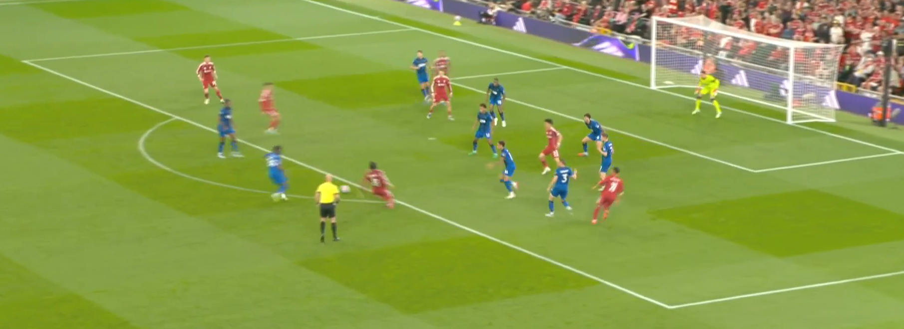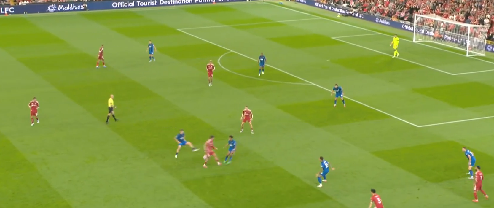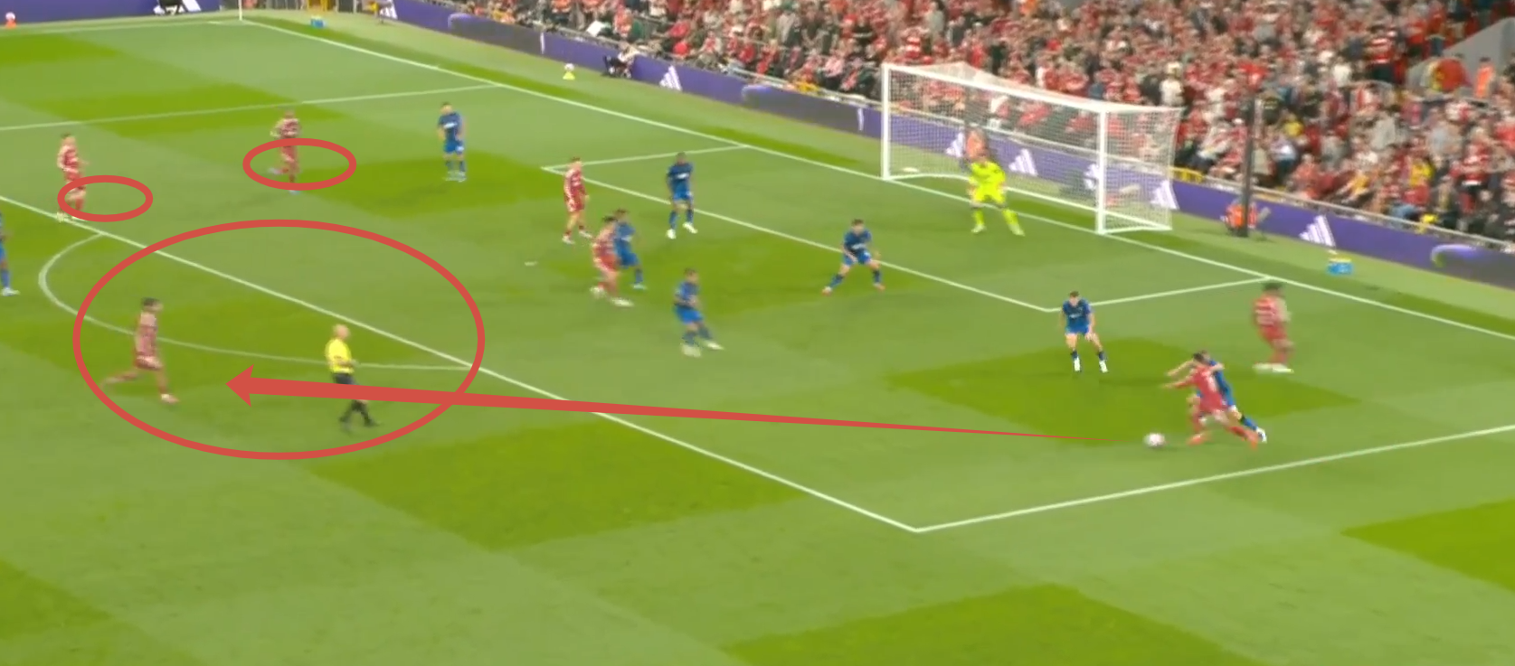 Здесь Уго показывает, почему заплаченные за него 90 млн абсолютно оправданы. Экитике «раздергал» Диаките, который выбросился и остался в полупозиции: освободил зону и не доиграл эпизод. Уго хотел вновь наполнить зону, но увидел подключение Виртца и решил увести Диаките дальше из зоны, отыгравшись с партнером, создал открытый мяч Маккалистеру, обнаруживает зону, которую ему создали Виртц своим движением и Сенеси своей безответственностью (аргентинец четко видит, что он является страхующим защитником и что Адамс доигрывает эпизод за Виртцем, при этом идет вторым игроком в Виртца, оставляя самую важную зону – центральную). Диаките продолжает «держать воздух», Трюффе не сужает линию обороны, хотя должен по цепочке страховать зону партнера (Сенеси).